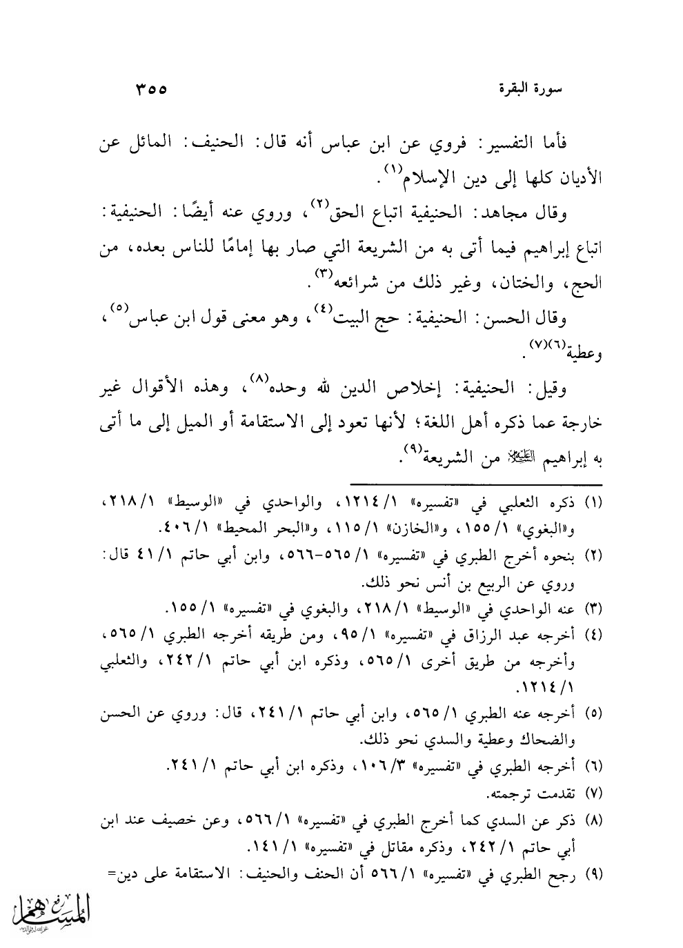 (¬9) رجح الطبري في "تفسيره" 1/ 566 أن الحنف والحنيف: الاستقامة على دين =