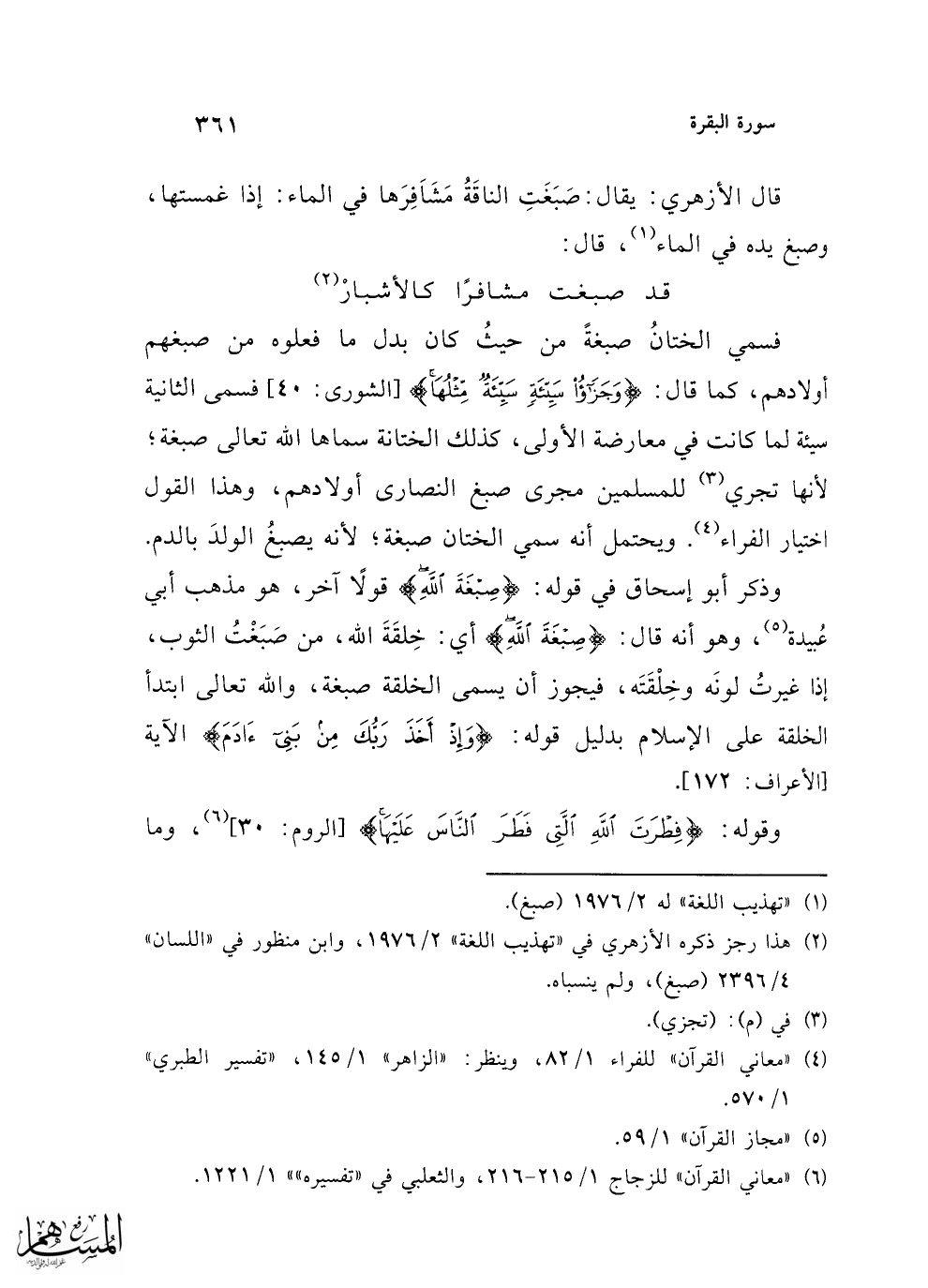 وذكر أبو إسحاق في قوله: {صِبْغَةَ اللَّهِ} قولًا آخر، هو مذهب أبي عُبيدة (¬5)، وهو أنه قال: {صِبْغَةَ اللَّهِ} أي: خِلقَةَ الله، من صبَغْتُ الثوب، إذا غيرتُ لونَه وخِلْقَتَه، فيجوز أن يسمى الخلقة صبغة، والله تعالى ابتدأ الخلقة على الإسلام بدليل قوله: {وَإِذْ أَخَذَ رَبُّكَ مِنْ بَنِي آدَمَ} [الأعراف: 172] الآية.