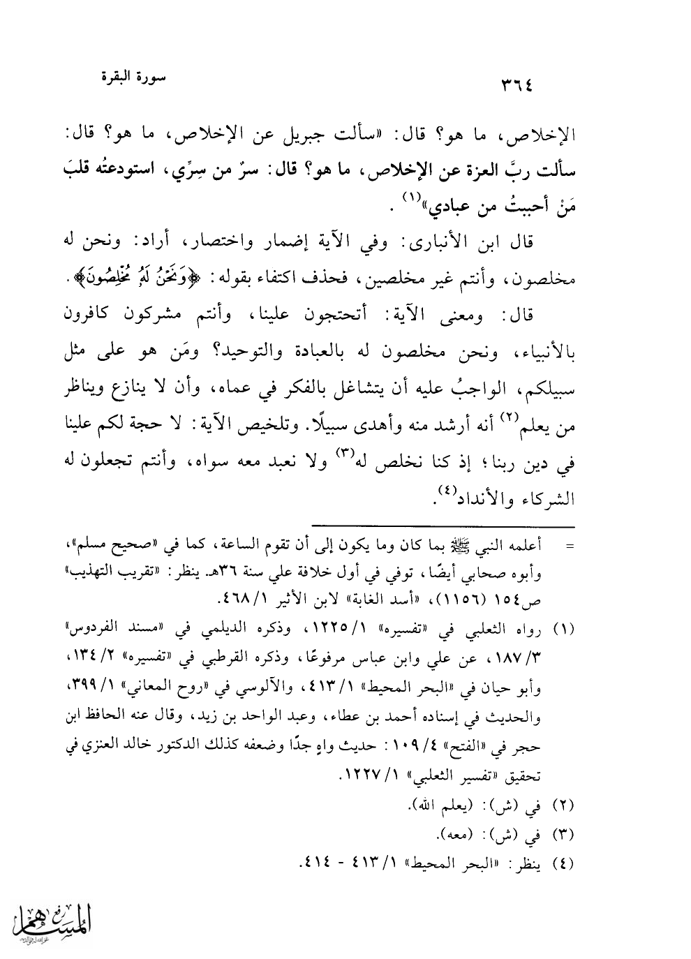 (¬1) رواه الثعلبي في "تفسيره" 1/ 1225، وذكره الديلمي في "مسند الفردوس" 3/ 187، عن علي وابن عباس مرفوعًا، وذكره القرطبي في "تفسيره" 2/ 134، وأبو حيان في "البحر المحيط" 1/ 413، والآلوسي في "روح المعاني" 1/ 399، والحديث في إسناده أحمد بن عطاء، وعبد الواحد بن زيد، وقال عنه الحافظ ابن حجر في "الفتح" 4/ 109: حديث واهٍ جدًا وضعفه كذلك الدكتور خالد العنزي في تحقيق "تفسير الثعلبي" 1/ 1227.