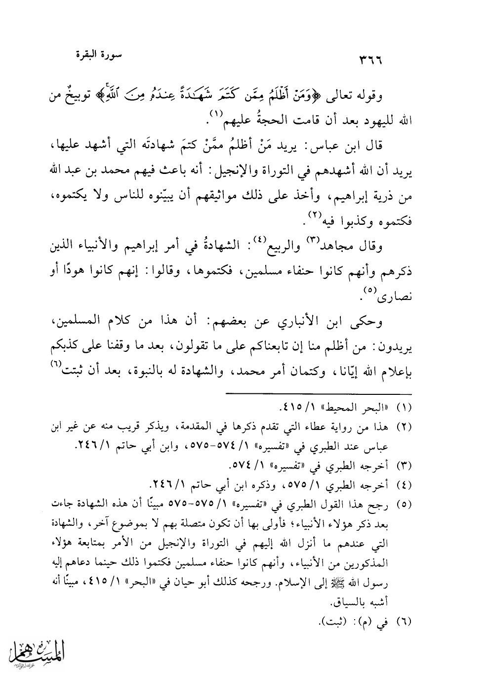 (¬5) رجح هذا القول الطبري في "تفسيره" 1/ 575 - 575 مبينًا أن هذه الشهادة جاءت بعد ذكر هؤلاء الأنبياء؛ فأولى بها أن تكون متصلة بهم لا بموضوع آخر، والشهادة التي عندهم ما أنزل الله إليهم في التوراة والإنجيل من الأمر بمتابعة هؤلاء المذكورين من الأنبياء، وأنهم كانوا حنفاء مسلمين فكتموا ذلك حينما دعاهم إليه رسول الله - صلى الله عليه وسلم - إلى الإسلام. ورجحه كذلك أبو حيان في "البحر" 1/ 415، مبينا أنه أشبه بالسياق.