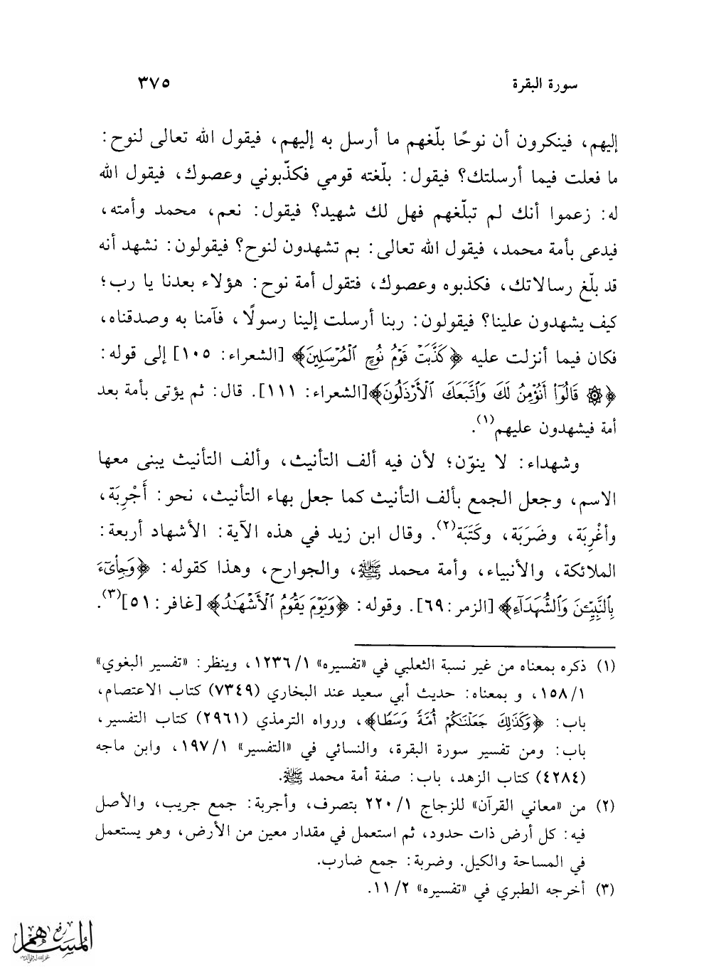 إليهم، فينكرون أن نوحًا بلّغهم ما أرسل به إليهم، فيقول الله تعالى لنوح: ما فعلت فيما أرسلتك؟ فيقول: بلّغته قومي فكذّبوني وعصوك، فيقول الله له: زعموا أنك لم تبلّغهم فهل لك شهيد؟ فيقول: نعم، محمد وأمته، فيدعى بأمة محمد، فيقول الله تعالى: بم تشهدون لنوح؟ فيقولون: نشهد أنه قد بلّغ رسالاتك، فكذبوه وعصوك، فتقول أمة نوح: هؤلاء بعدنا يارب؛ كيف يشهدون علينا؟ فيقولون: ربنا أرسلت إلينا رسولًا، فآمنا به وصدقناه، فكان فيما أنزلت عليه {كَذَّبَتْ قَوْمُ نُوحٍ الْمُرْسَلِينَ} [الشعراء: 105]، إلى قوله: {قَالُوا أَنُؤْمِنُ لَكَ وَاتَّبَعَكَ الْأَرْذَلُونَ} [الشعراء: 111]. قال: ثم يؤتى بأمة بعد أمة فيشهدون عليهم (¬1).