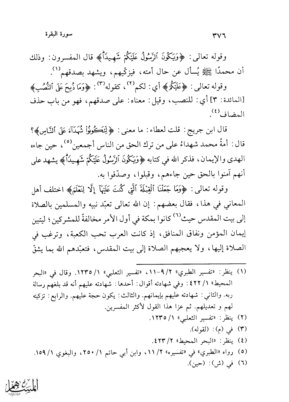 قال ابن جريج: قلت لعطاء: ما معنى: {لِتَكُونُوا شُهَدَاءَ عَلَى النَّاسِ}؟ قال: أمةُ محمد شهداءُ على من ترك الحق من الناس أجمعين (¬5)، حين جاءه الهدى والإيمان، فذكر الله في كتابه {وَيَكُونَ الرَّسُولُ عَلَيْكُمْ شَهِيدًا} يشهد على أنهم آمنوا بالحق حين جاءهم، وقبلوا، وصدّقوا به.