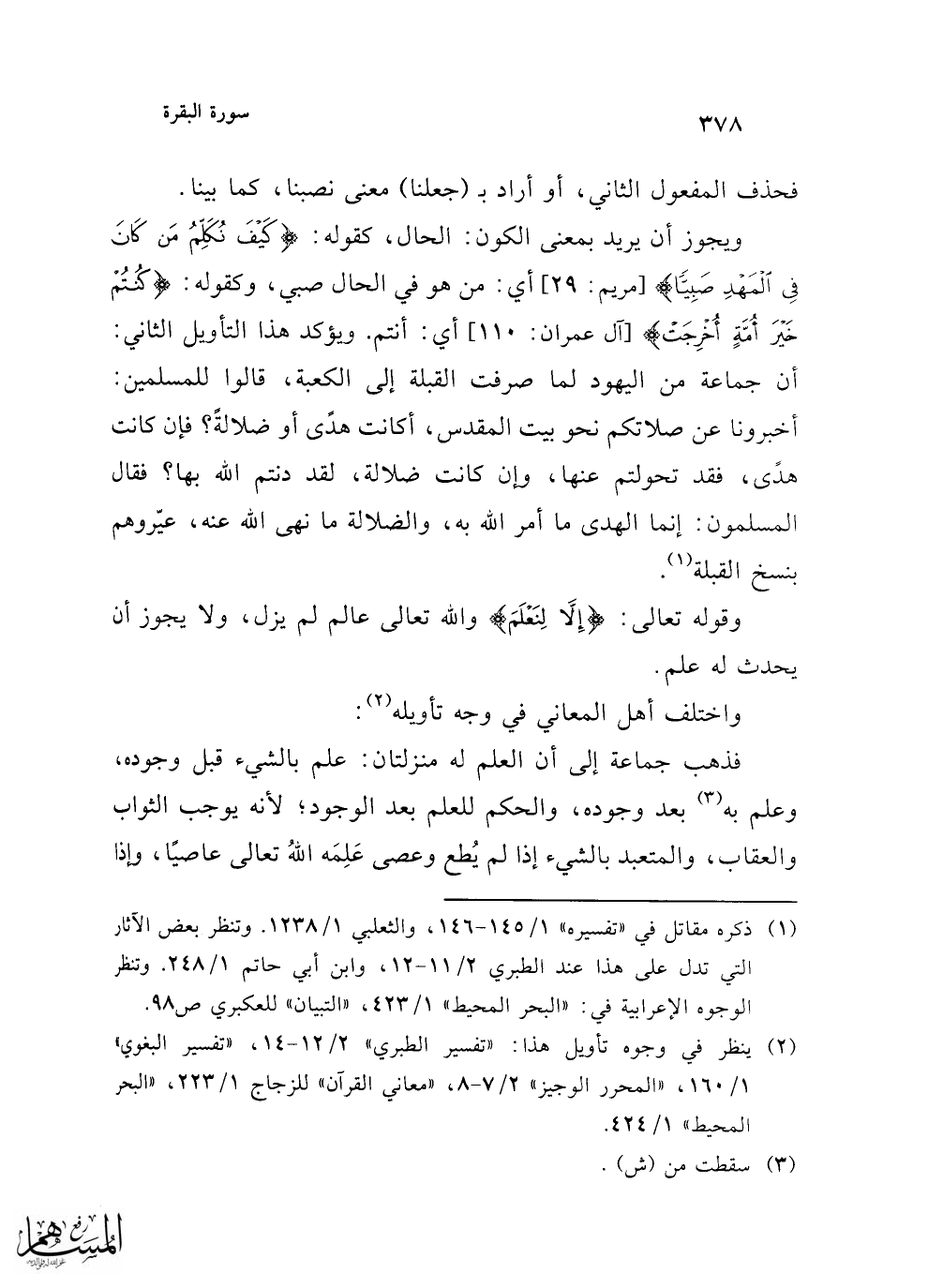 ويجوز أن يريد بمعنى الكون: الحال، كقوله: {كَيْفَ نُكَلِّمُ مَنْ كَانَ فِي الْمَهْدِ صَبِيًّا} [مريم: 29] أي: من هو في الحال صبي، وكقوله: {كُنْتُمْ خَيْرَ أُمَّةٍ أُخْرِجَتْ} [آل عمران: 110] أي: أنتم. ويؤكد هذا التأويل الثاني: أن جماعة من اليهود لما صرفت القبلة إلى الكعبة، قالوا للمسلمين: أخبرونا عن صلاتكم نحو بيت المقدس، أكانت هدًى أو ضلالةً؟ فإن كانت هدًى، فقد تحولتم عنها، وإن كانت ضلالة، لقد دنتم الله بها؟ فقال المسلمون: إنما الهدى ما أمر الله به، والضلالة ما نهى الله عنه، عيّروهم بنسخ القبلة (¬1).