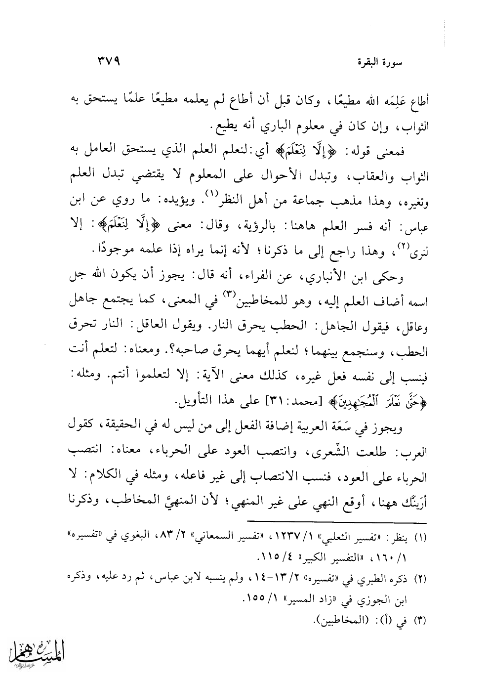 فمعنى قوله: {إِلَّا لِنَعْلَمَ} أي: لنعلم العلم الذي يستحق العامل به الثواب والعقاب، وتبدل الأحوال على المعلوم لا يقتضي تبدل العلم وتغيره، وهذا مذهب جماعة من أهل النظر (¬1). ويؤيده: ما روي عن ابن عباس: أنه فسر العلم هاهنا: بالرؤية، وقال: معنى {إِلَّا لِنَعْلَمَ}: إلا لنرى (¬2)، وهذا راجع إلى ما ذكرنا؛ لأنه إنما يراه إذا علمه موجودًا.