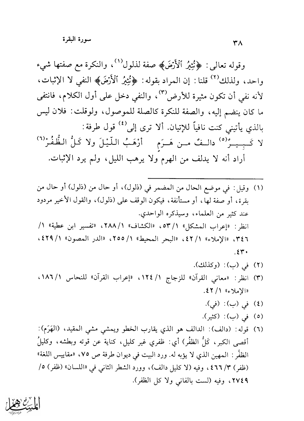 وقوله تعالى: {تُثِيرُ الأَرْضَ} صفة لذلول (¬1)، والنكرة مع صفتها شيء واحد، ولذلك (¬2) قلنا: إن المراد بقوله: {تُثِيرُ الأَرْضَ} النفي لا الإثبات، لأنه نفي أن تكون مثيرة للأرض (¬3)، والنفي دخل على أول الكلام، فانتفى ما كان ينضم إليه، والصفة للنكرة كالصلة للموصول، ولو قلت: فلان ليس بالذي يأتيني كنت نافيًا للإتيان. ألا ترى إلى (¬4) قول طرفة: