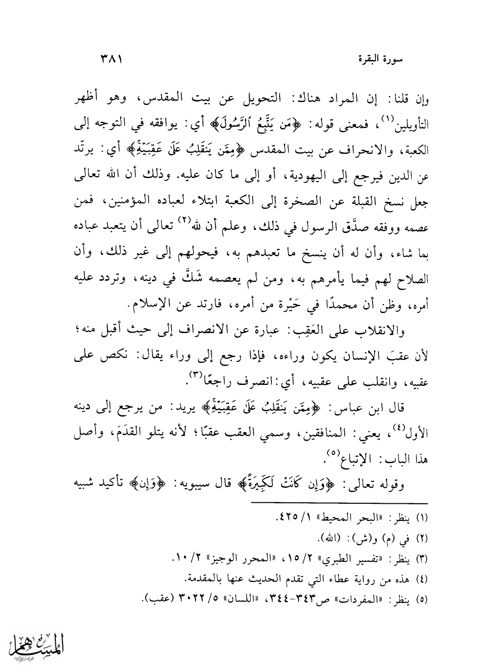 وإن قلنا: إن المراد هناك: التحويل عن بيت المقدس، وهو أظهر التأويلين (¬1)، فمعنى قوله: {مَنْ يَتَّبِعُ الرَّسُولَ} أي: يوافقه في التوجه إلى الكعبة، والانحراف عن بيت المقدس {مِمَّنْ يَنْقَلِبُ عَلَى عَقِبَيْهِ} أي: يرتّد عن الدين فيرجع إلى اليهودية، أو إلى ما كان عليه. وذلك أن الله تعالى جعل نسخ القبلة عن الصخرة إلى الكعبة ابتلاء لعباده المؤمنين، فمن عصمه ووفقه صدَّق الرسول في ذلك، وعلم أن لله (¬2) تعالى أن يتعبد عباده بما شاء، وأن له أن ينسخ ما تعبدهم به، فيحولهم إلى غير ذلك، وأن الصلاح لهم فيما يأمرهم به، ومن لم يعصمه شَكَّ في دينه، وتردد عليه أمره، وظن أن محمدًا في حَيْرة من أمره، فارتد عن الإسلام.
