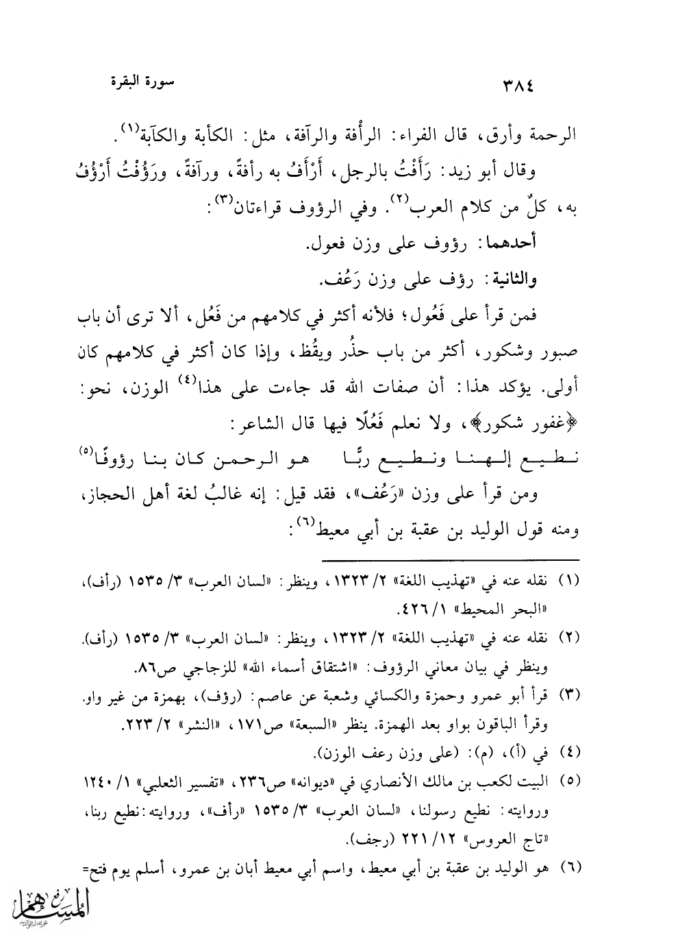 (¬5) البيت لكعب بن مالك الأنصاري في "ديوانه" ص 236، "تفسير الثعلبي" 1/ 1240 وروايته: نطيع رسولنا، "لسان العرب" 3/ 1535 "رأف"، وروايته: نطيع ربنا، "تاج العروس" 12/ 221 (رجف).