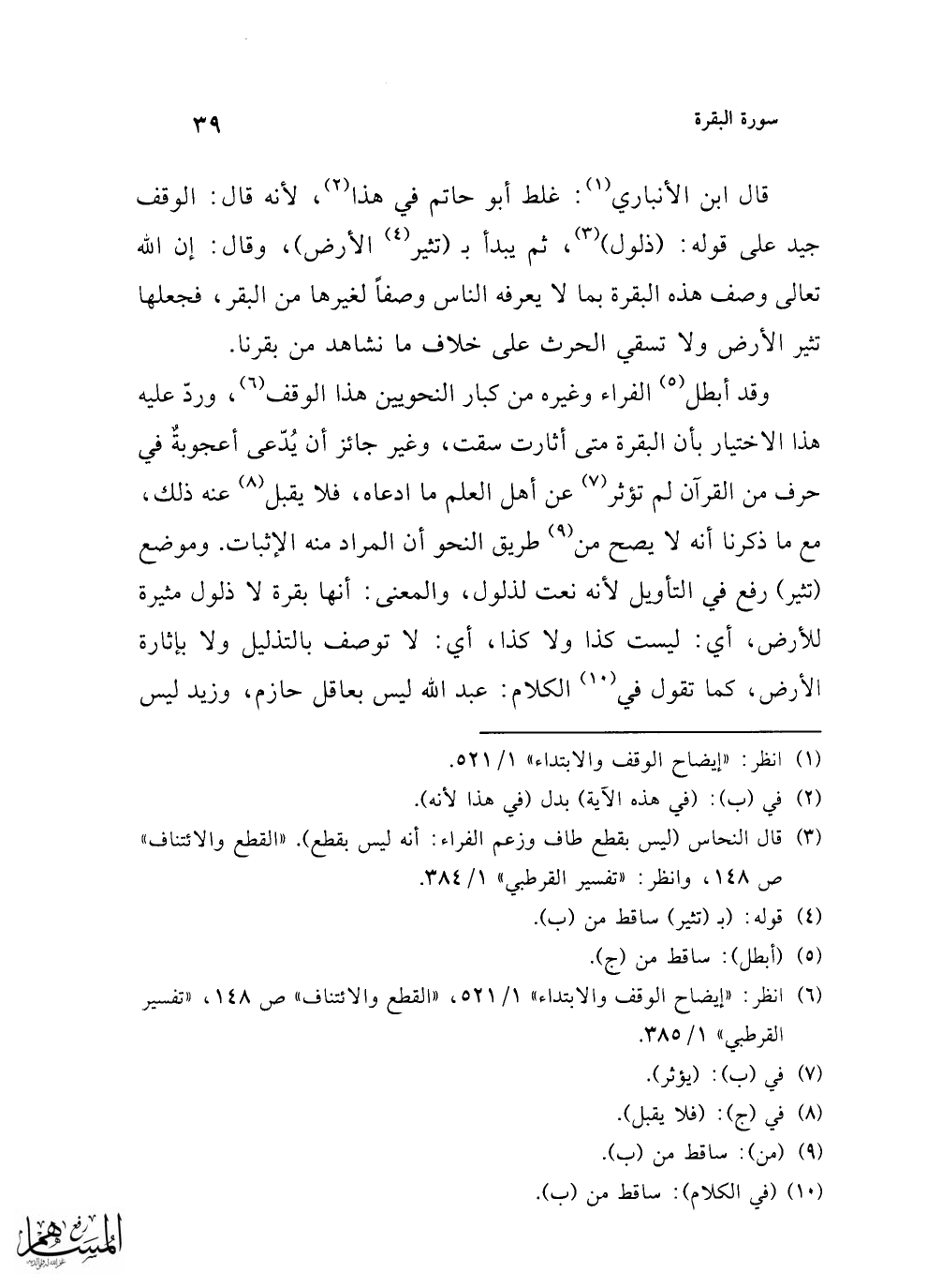 قال ابن الأنباري (¬1): غلط أبو حاتم في هذا (¬2)، لأنه قال: الوقف جيد على قوله: (ذلول) (¬3)، ثم يبدأ بـ (تثير (¬4) الأرض)، وقال: إن الله تعالى وصف هذه البقرة بما لا يعرفه الناس وصفاً لغيرها من البقر، فجعلها تثير الأرض ولا تسقي الحرث على خلاف ما نشاهد من بقرنا.