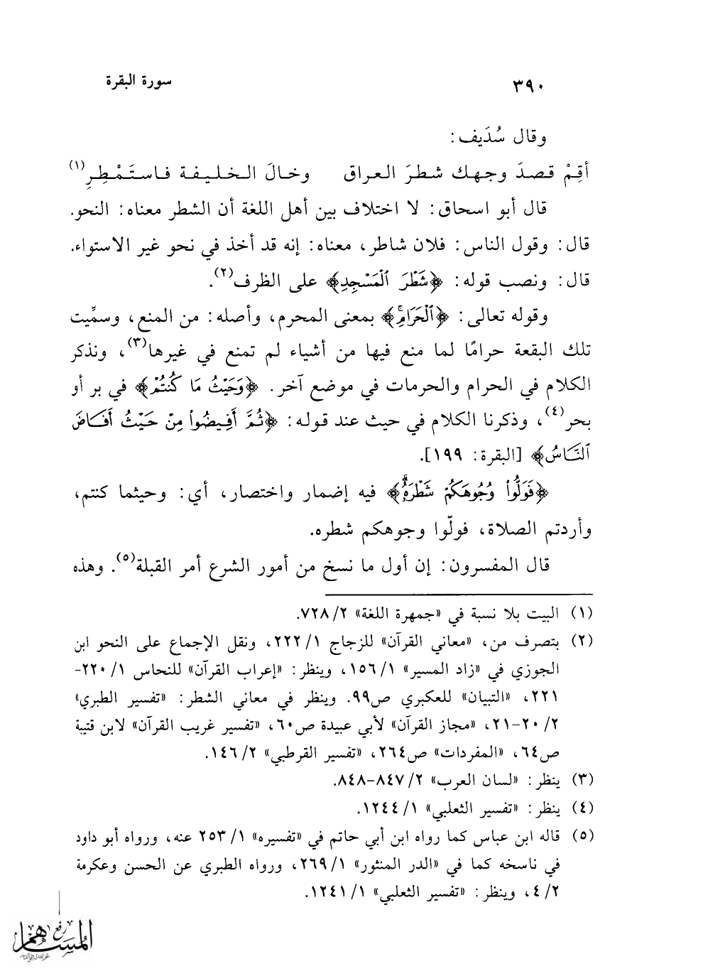 (¬2) بتصرف من "معاني القرآن" للزجاج 1/ 222، ونقل الإجماع على النحو ابن الجوزي في "زاد المسير" 1/ 156، وينظر: "إعراب القرآن" للنحاس 1/ 220 - 221، "التبيان" للعكبري ص 99. وينظر في معاني الشطر: "تفسير الطبري" 2/ 20 - 21، "مجاز القرآن" لأبي عبيدة ص 60، "تفسير غريب القرآن" لابن قتيبة ص 64، "المفردات" ص 264، "تفسير القرطبي" 2/ 146.