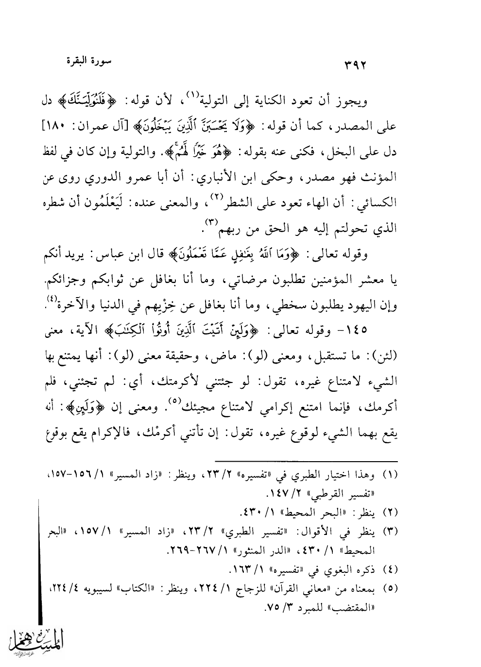 ويجوز أن تعود الكناية إلى التولية (¬1)، لأن قوله: {فَلَنُوَلِّيَنَّكَ} دل على المصدر، كما أن قوله: {وَلَا يَحْسَبَنَّ الَّذِينَ يَبْخَلُونَ} [آل عمران: 180] دل على البخل، فكنى عنه بقوله: {هُوَ خَيْرًا لَهُمْ}. والتولية وإن كان في لفظ المؤنث فهو مصدر، وحكى ابن الأنباري: أن أبا عمرو الدوري روى عن الكسائي: أن الهاء تعود على الشطر (¬2)، والمعنى عنده: لَيَعْلَمُون أن شطره الذي تحولتم إليه هو الحق من ربهم (¬3).