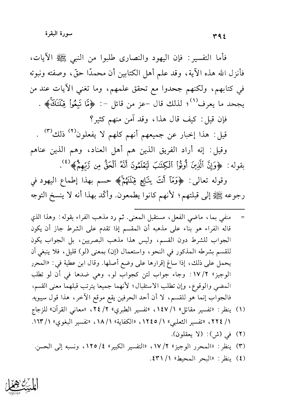 فأما التفسير: فإن اليهود والنصارى طلبوا من النبي - صلى الله عليه وسلم - الآيات، فأنزل الله هذه الآية، وقد علم أهل الكتابين أن محمدًا حقّ، وصفته ونبوته في كتابهم، ولكنهم جحدوا مع تحقق علمهم، وما تغني الآيات عند من يجحد ما يعرف (¬1)؛ لذلك قال -عز من قائل-: {مَا تَبِعُوا قِبْلَتَكَ}.
