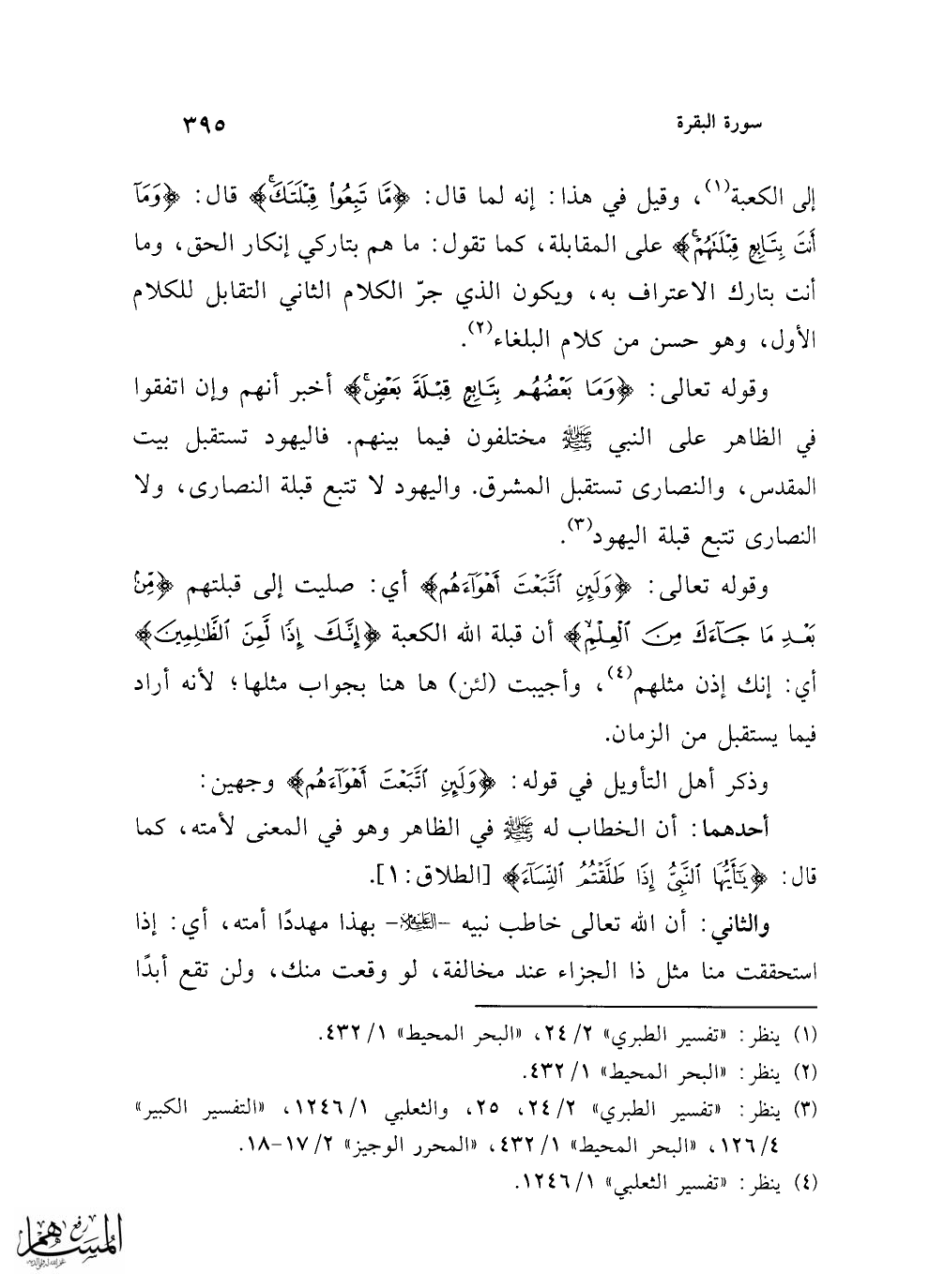 (¬3) ينظر: "تفسير الطبري" 2/ 24، 25 والثعلبي 1/ 1246، "التفسير الكبير" 4/ 126، "البحر المحيط" 1/ 432، " المحرر الوجيز" 2/ 17 - 18.