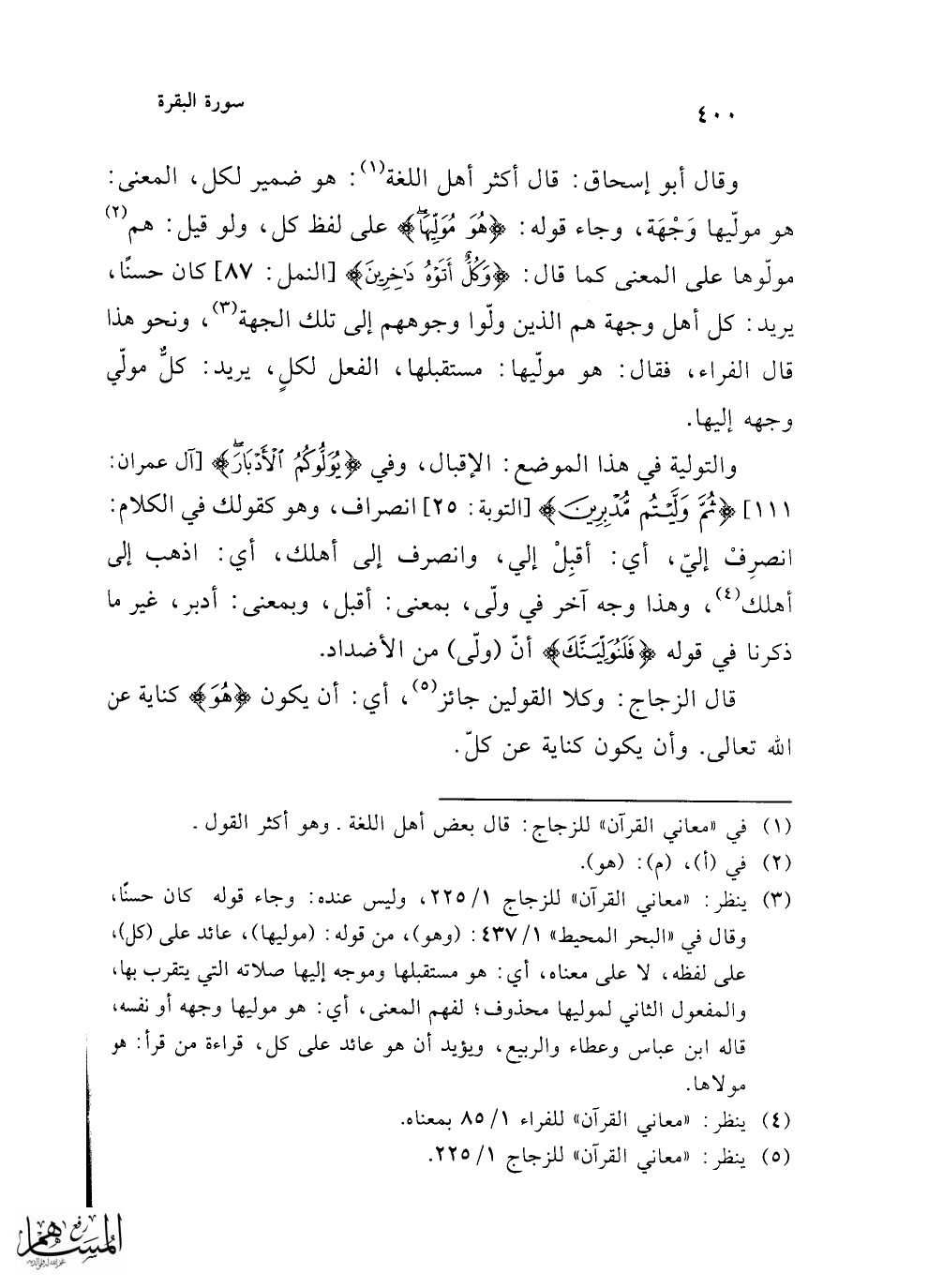 (¬3) ينظر: "معاني القرآن" للزجاج 1/ 225، وليس عنده: وجاء قوله كان حسنًا، وقال في "البحر المحيط" 1/ 437: (وهو)، من قوله: (موليها)، عائد على (كل)، على لفظه، لا على معناه، أي: هو مستقبلها وموجه إليها صلاته التي يتقرب بها، والمفعول الثاني لموليها محذوف؛ لفهم المعنى، أي: هو موليها وجهه أو نفسه، قاله ابن عباس وعطاء والربيع، ويؤيد أن هو عائد على كل، قراءة من قرأ: هو مولاها.