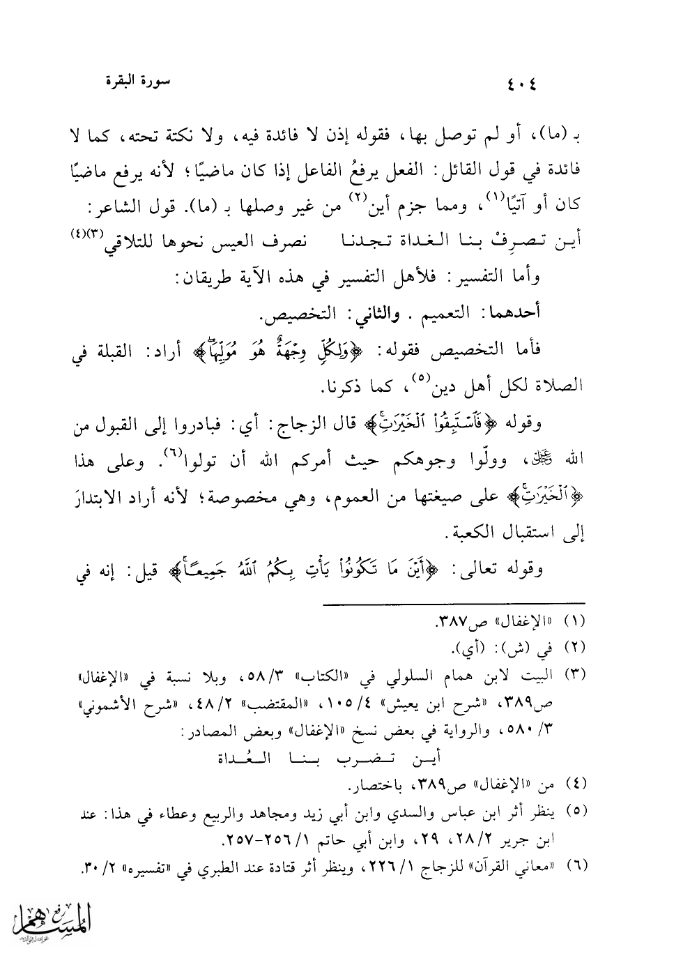 وقوله {فَاسْتَبِقُوا الْخَيْرَاتِ} قال الزجاج: أي: فبادروا إلى القبول من الله عز وجل، وولّوا وجوهكم حيث أمركم الله أن تولوا (¬6). وعلى هذا {الْخَيْرَاتِ} على صيغتها من العموم، وهي مخصوصة؛ لأنه أراد الابتدارَ إلى استقبال الكعبة.