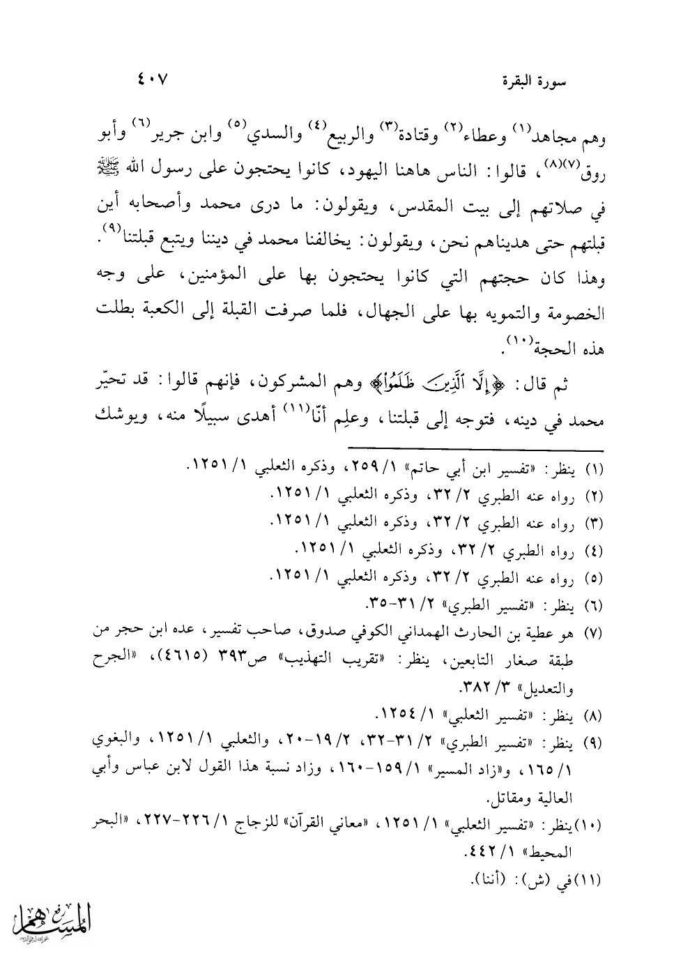 وهم مجاهد (¬1) وعطاء (¬2) وقتادة (¬3) والربيع (¬4) والسدي (¬5) وابن جرير (¬6) وأبو روق (¬7) (¬8)، قالوا: الناس هاهنا اليهود، كانوا يحتجون على رسول الله - صلى الله عليه وسلم - في صلاتهم إلى بيت المقدس، ويقولون: ما درى محمد وأصحابه أين قبلتهم حتى هديناهم نحن، ويقولون: يخالفنا محمد في ديننا ويتبع قبلتنا (¬9). وهذا كان حجتهم التي كانوا يحتجون بها على المؤمنين، على وجه الخصومة والتمويه بها على الجهال، فلما صرفت القبلة إلى الكعبة بطلت هذه الحجة (¬10).