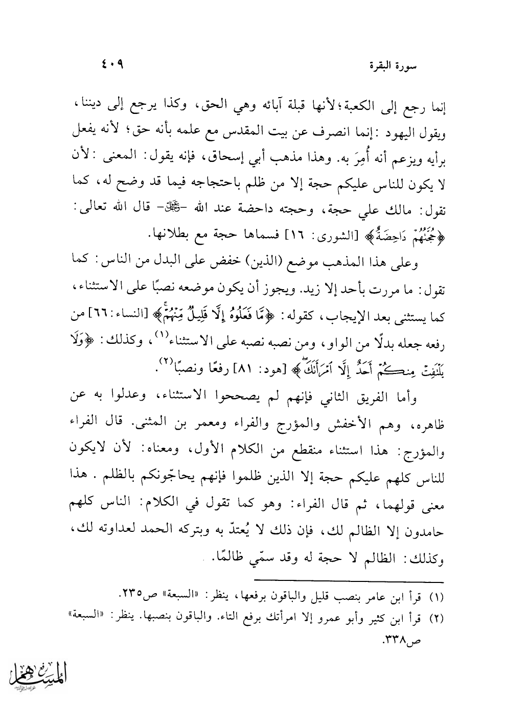 إنما رجع إلى الكعبة؛ لأنها قبلة آبائه وهي الحق، وكذا يرجع إلى ديننا، ويقول اليهود: إنما انصرف عن بيت المقدس مع علمه بأنه حق؛ لأنه يفعل برأيه ويزعم أنه أُمِرَ به. وهذا مذهب أبي إسحاق، فإنه يقول: المعنى: لأن لا يكون للناس عليكم حجة إلا من ظلم باحتجاجه فيما قد وضح له، كما تقول: مالك علي حجة، وحجته داحضة عند الله -عز وجل- قال الله تعالى: {حُجَّتُهُمْ دَاحِضَةٌ} [الشورى: 16]، فسماها حجة مع بطلانها.