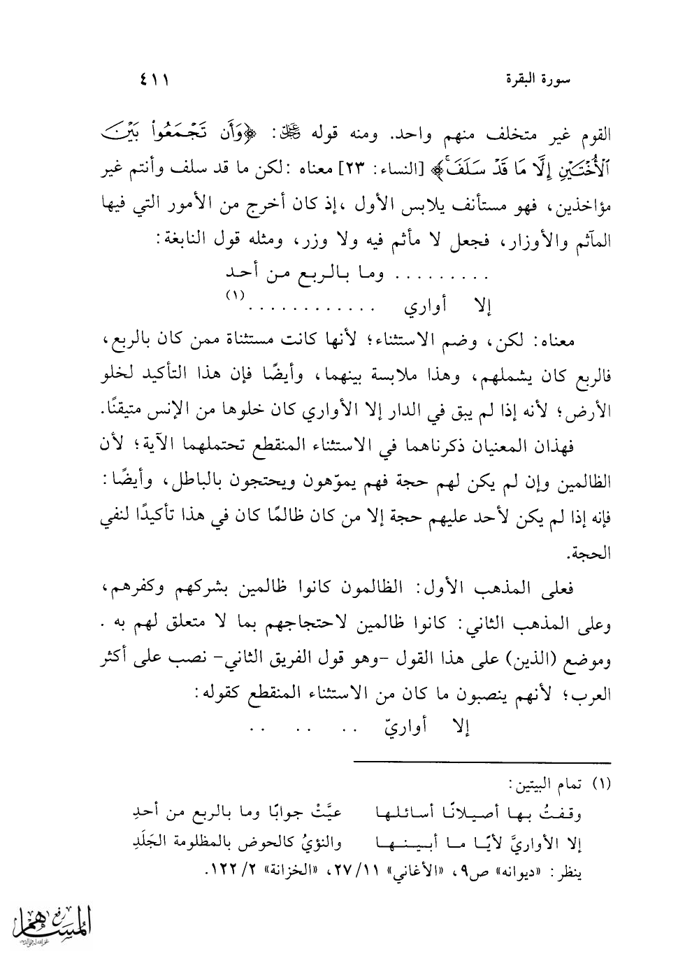 فهذان المعنيان ذكرناهما في الاستثناء المنقطع تحتملهما الآية؛ لأن الظالمين وإن لم يكن لهم حجة فهم يموّهون ويحتجون بالباطل، وأيضًا: فإنه إذا لم يكن لأحد عليهم حجة إلا من كان ظالمًا كان في هذا تأكيدًا لنفي الحجة.