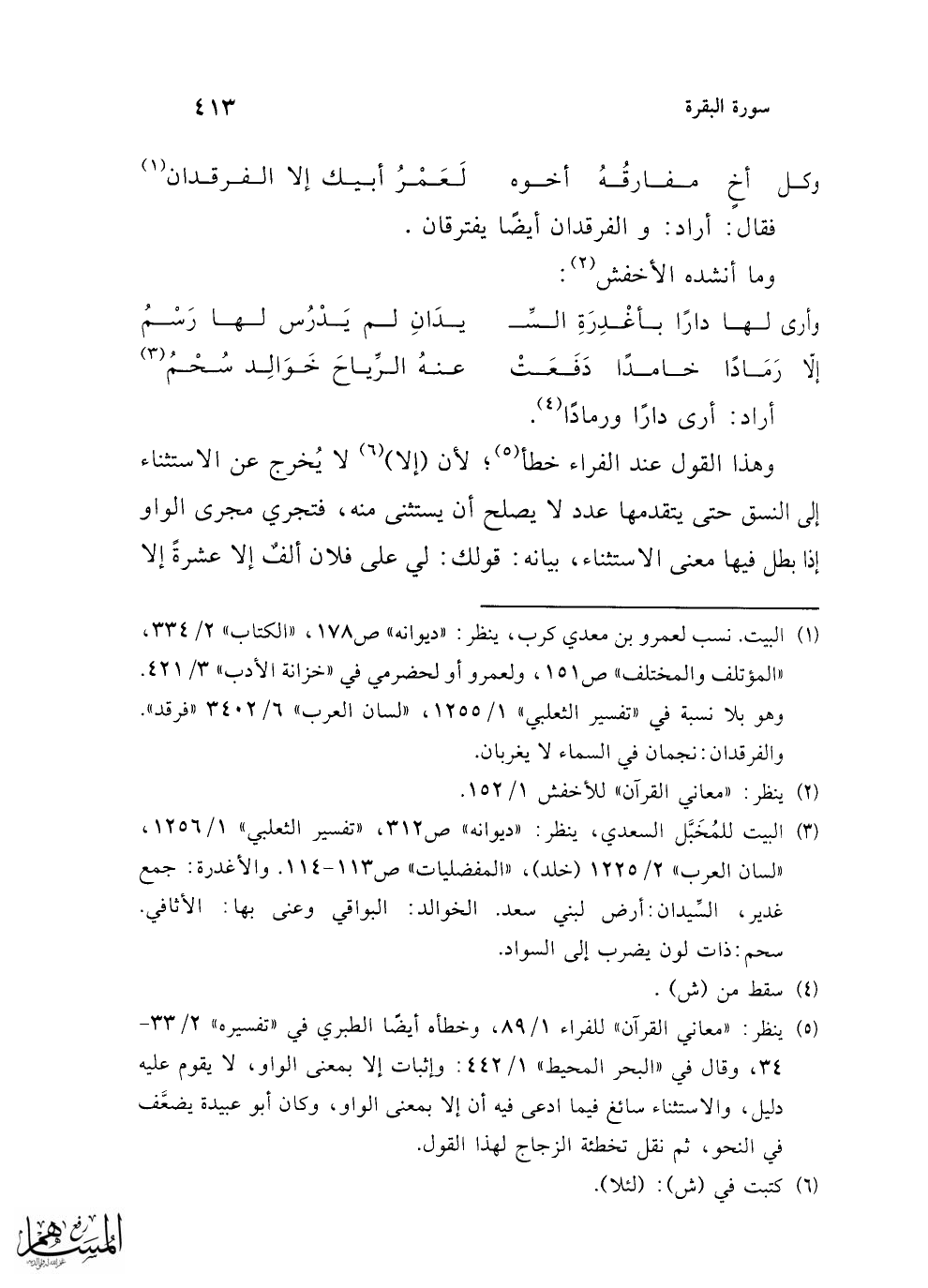 (¬3) البيت للمُخَبَّل السعدي، ينظر: "ديوانه" ص 312، "تفسير الثعلبي" 1/ 1256، "لسان العرب" 2/ 1225 (خلد)، "المفضليات" ص 113 - 114. والأغدرة: جمع غدير، السِّيدان: أرض لبني سعد. الخوالد: البواقي وعنى بها: الأثافي. سحم: ذات لون يضرب إلى السواد.