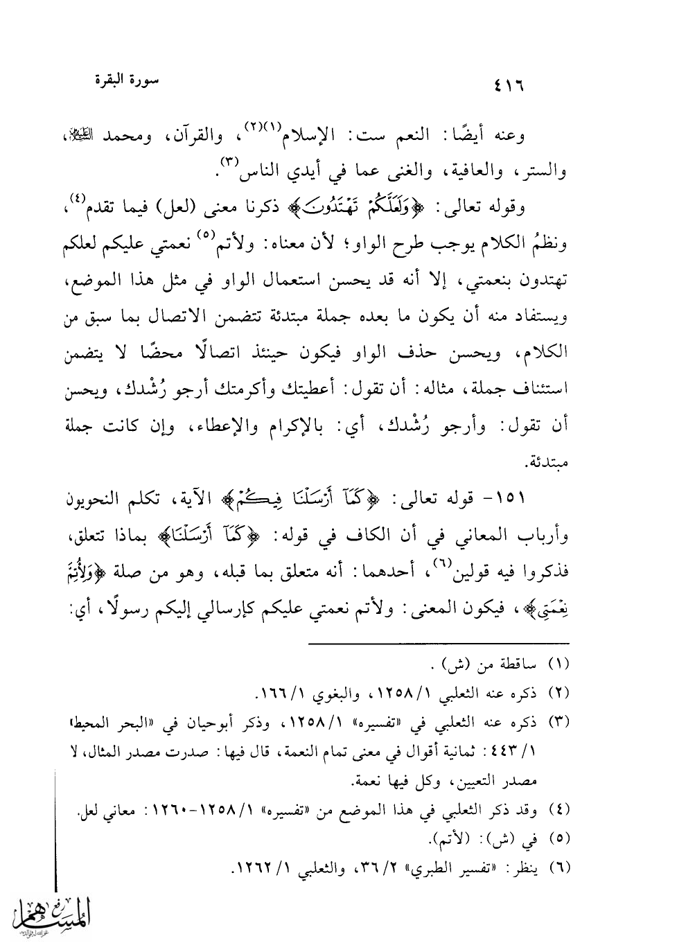 وقوله تعالى: {وَلَعَلَّكُمْ تَهْتَدُونَ} ذكرنا معنى (لعل) فيما تقدم (¬4)، ونظمُ الكلام يوجب طرح الواو؛ لأن معناه: ولأتم (¬5) نعمتي عليكم لعلكم تهتدون بنعمتي، إلا أنه قد يحسن استعمال الواو في مثل هذا الموضع، ويستفاد منه أن يكون ما بعده جملة مبتدئة تتضمن الاتصال بما سبق من الكلام، ويحسن حذف الواو فيكون حينئذ اتصالًا محضًا لا يتضمن استئناف جملة، مثاله: أن تقول: أعطيتك وأكرمتك أرجو رُشْدك، ويحسن أن تقول: وأرجو رُشْدك، أي: بالإكرام والإعطاء، وإن كانت جملة مبتدئة.