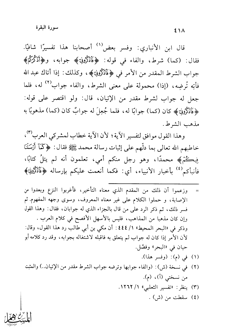 قال ابن الأنباري: وفسر بعض (¬1) أصحابنا هذا تفسيرًا شافيًا. فقال: (كما) شرط، والفاء في قوله: {فَاذْكُرُونِي} جوابه، و {أَذْكُرْكُمْ} جواب الشرط المقدر من الأمر في {فَاذْكُرُونِي} وكذلك: إذا أتاك عبد الله فأتِه تُرضِه، (إذا) محمولة على معنى الشرط، والفاء جواب (¬2) له، فلما جعل له جواب لشرط مقدر من الإتيان، قال: ولو اقتصر على قوله: {فَاذْكُرُونِي} كان (كما) جوابًا له، فلما جُعِلَ له جوابٌ كان (كما) مذهوبًا به مذهب الشرط.