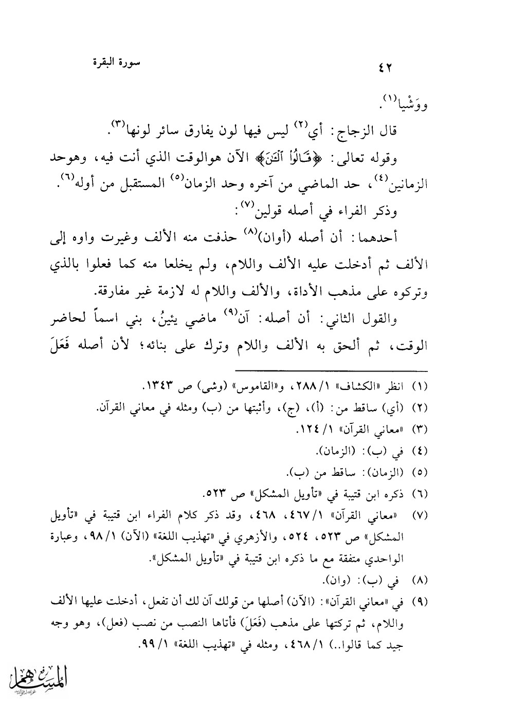 (¬7) "معاني القرآن" 1/ 467، 468، وقد ذكر كلام الفراء ابن قتيبة في "تأويل المشكل" ص 523، 524، والأزهري في "تهذيب اللغة" (الآن) 1/ 98، وعبارة الواحدي متفقة مع ما ذكره ابن قتيبة في "تأويل المشكل".