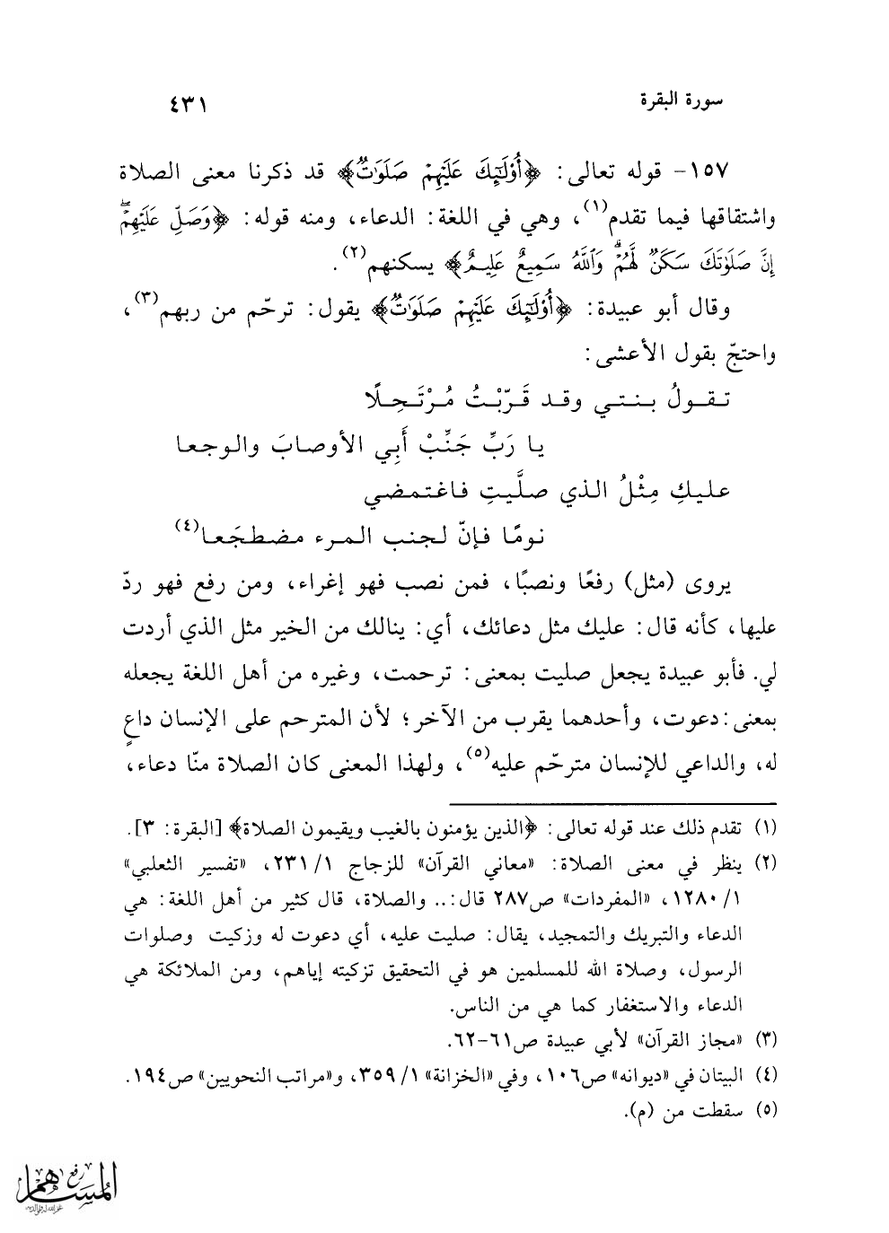 157 - قوله تعالى: {أُولَئِكَ عَلَيْهِمْ صَلَوَاتٌ} قد ذكرنا معنى الصلاة واشتقاقها فيما تقدم (¬1)، وهي في اللغة: الدعاء، ومنه قوله: {وَصَلِّ عَلَيْهِمْ إِنَّ صَلَاتَكَ سَكَنٌ لَهُمْ وَاللَّهُ سَمِيعٌ عَلِيمٌ} يسكنهم (¬2).