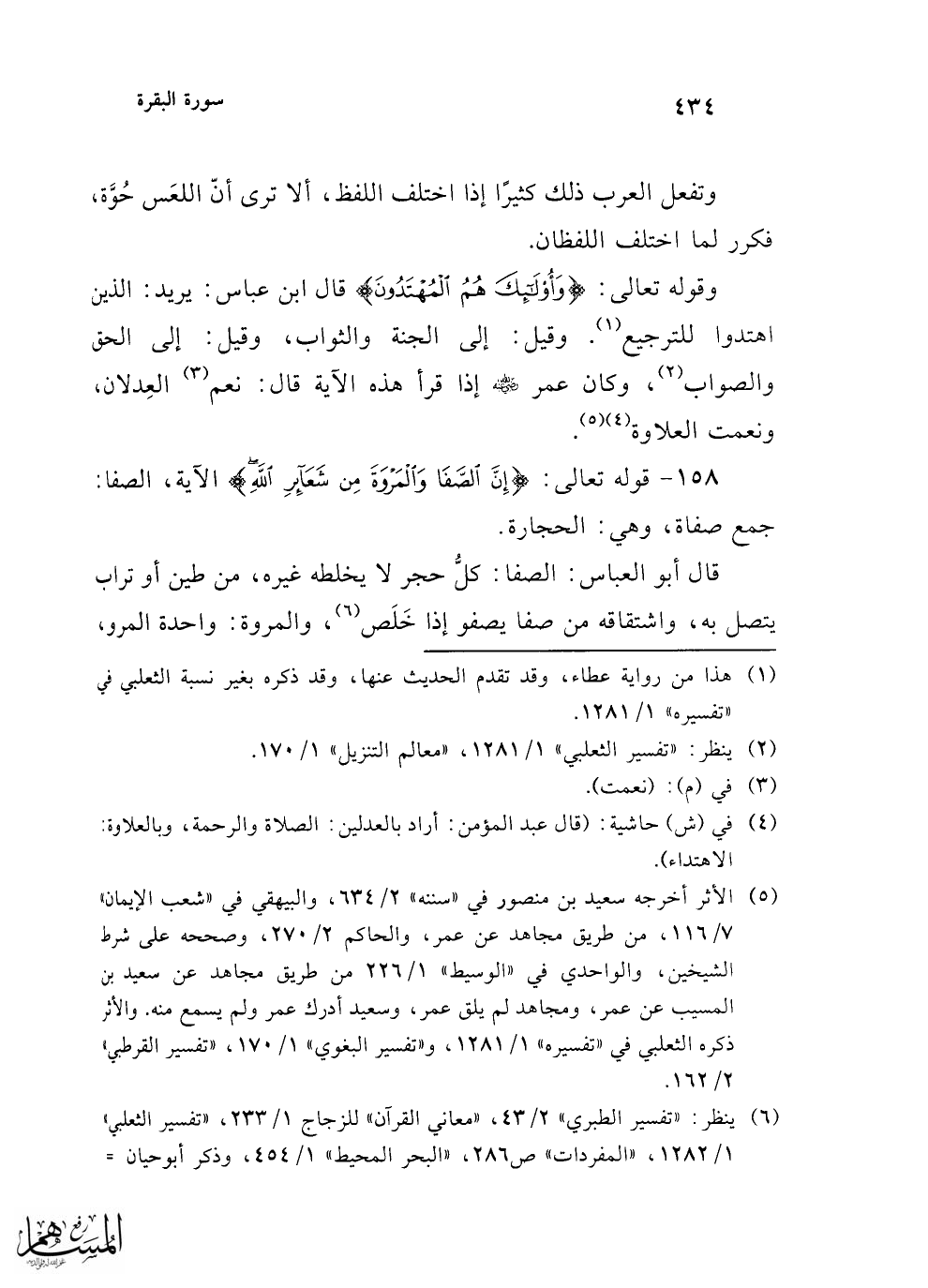 (¬6) ينظر: "تفسير الطبري" 2/ 43، "معاني القرآن" للزجاج 1/ 233، "تفسير الثعلبي" 1/ 1282، "المفردات" ص 286، "البحر المحيط" 1/ 454، وذكر أبو حيان =