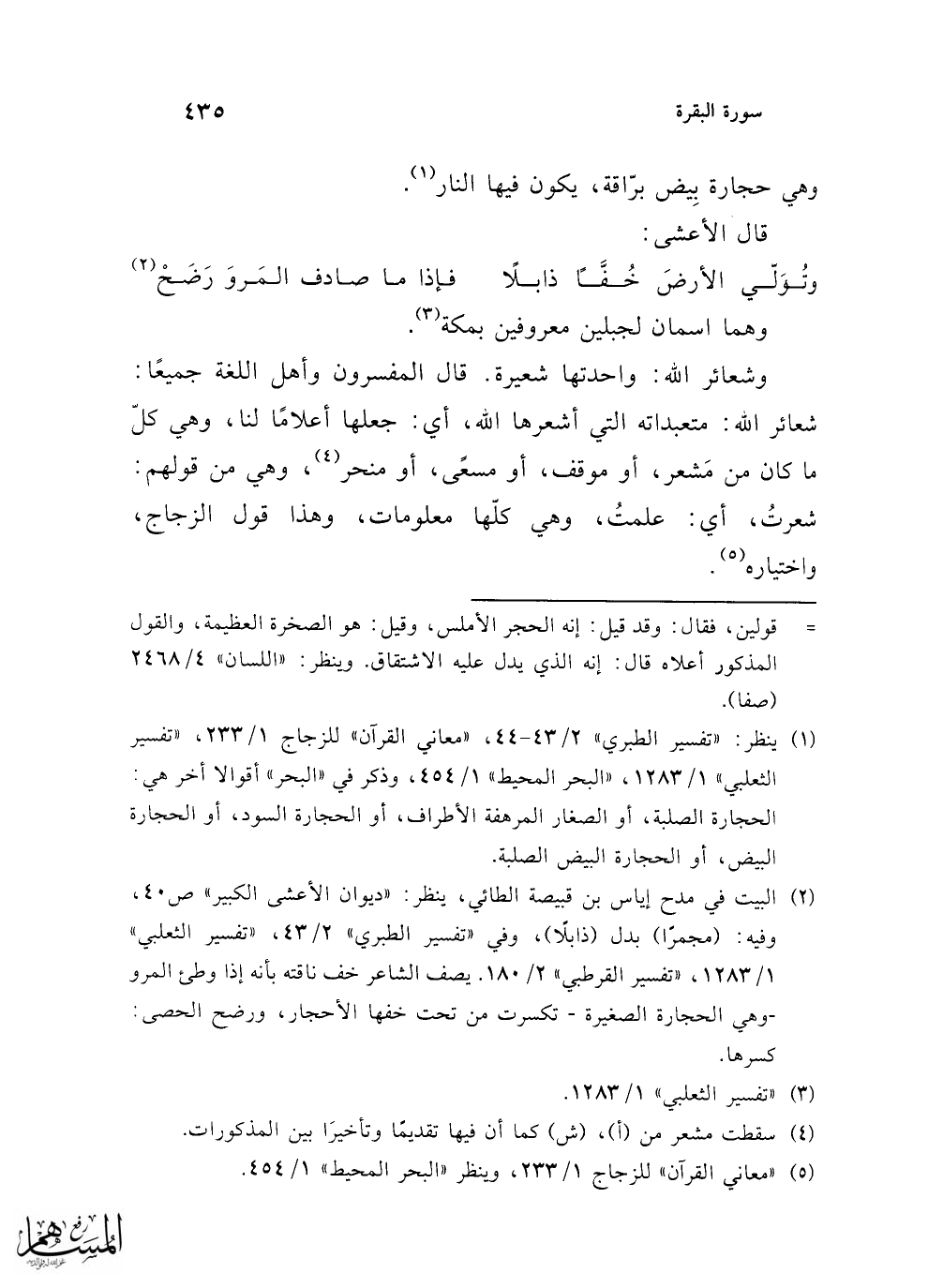 (¬1) ينظر: "تفسير الطبري" 2/ 43 - 44، "معاني القرآن" للزجاج 1/ 233،"تفسير الثعلبي" 1/ 1283، "البحر المحيط" 1/ 454، وذكر في "البحر" أقوالا أخر هي: الحجارة الصلبة، أو الصغار المرهفة الأطراف، أو الحجارة السود، أو الحجارة البيض، أو الحجارة البيض الصلبة.