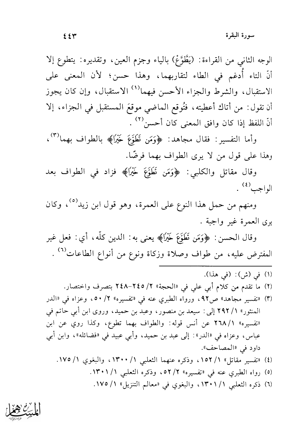 وأما التفسير: فقال مجاهد: {وَمَنْ تَطَوَّعَ خَيْرًا} بالطواف بهما (¬3)، وهذا على قول من لا يرى الطواف بهما فرضًا.