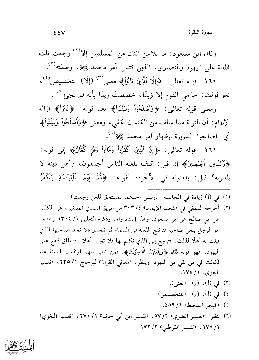 (¬2) أخرجه البيهقي في "شعب الإيمان" 4/ 303 من طريق السدي الصغير، عن الكلبي عن أبي صالح عن ابن مسعود، وهذا إسناد واه، وذكره الثعلبي 1/ 1304 ولفظه: هو الرجل يلعن صاحبه فترتفع اللعنة في السماء ثم تنحدر فلا تجد صاحبها الذي قيلت له أهلًا لذلك، فترجع إلى الذي تكلم بها فلا تجده أهلا، فتنطلق فتقع على اليهود، فهو قوله عز وجل {وَيَلْعَنُهُمُ اللَّاعِنُونَ}. فمن تاب منهم ارتفعت اللعنة عنه فكانت في من بقي من اليهود. وينظر: "معاني القرآن" للزجاج 1/ 235، "تفسير البغوي" 1/ 175.