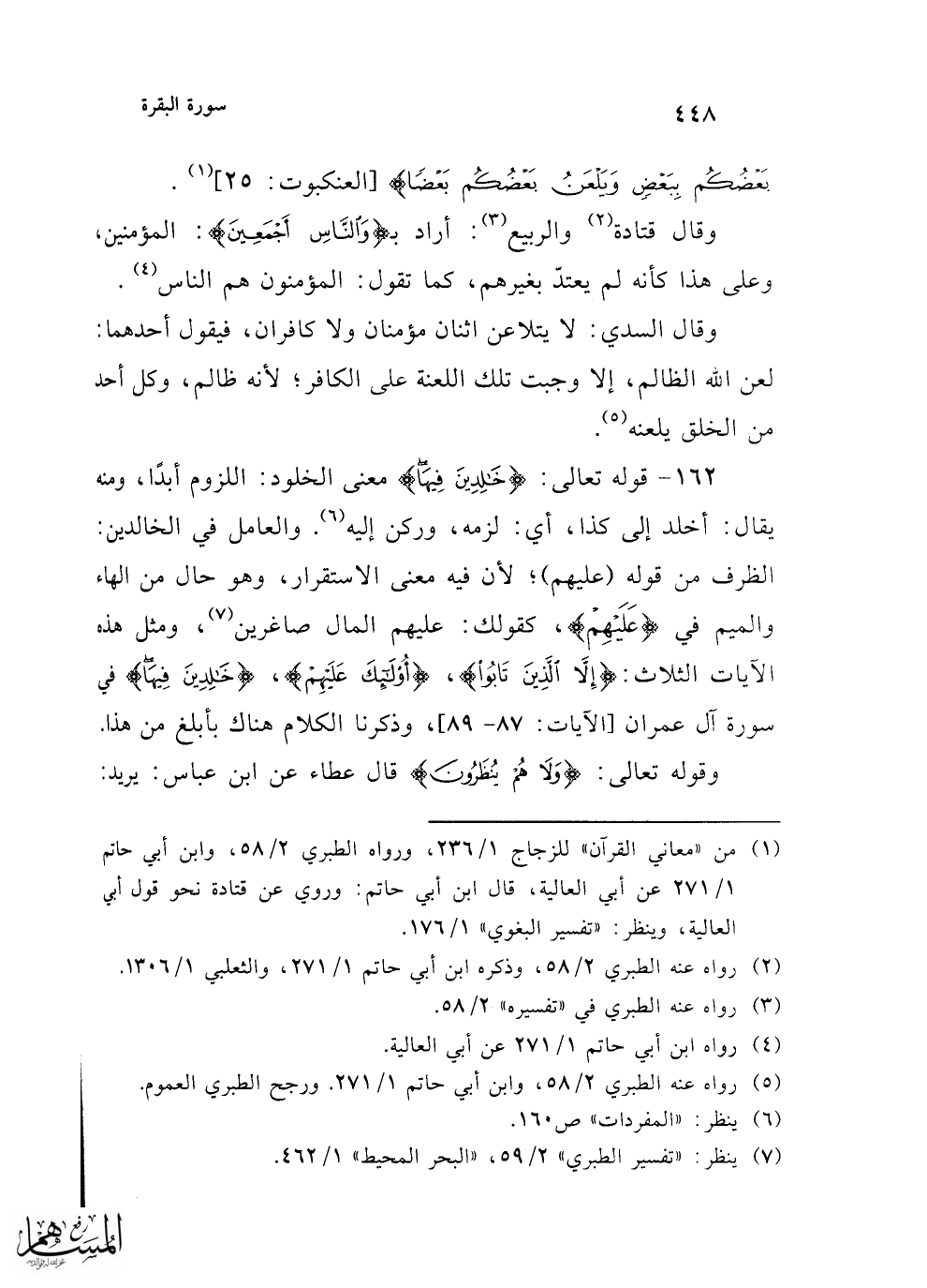 162 - قوله تعالى: {خَالِدِينَ فِيهَا} معنى الخلود: اللزوم أبدًا، ومنه يقال: أخلد إلى كذا، أي: لزمه، وركن إليه (¬6). والعامل في الخالدين: الظرف من قوله (عليهم)؛ لأن فيه معنى الاستقرار، وهو حال من الهاء والميم في {عَلَيْهِمْ}، كقولك: عليهم المال صاغرين (¬7)، ومثل هذه الآيات الثلاث: {إِلَّا الَّذِينَ تَابُوا}، {أُولَئِكَ عَلَيْهِمْ}، {خَالِدِينَ فِيهَا} في سورة آل عمران [الآيات: 87 - 89]، وذكرنا الكلام هناك بأبلغ من هذا.