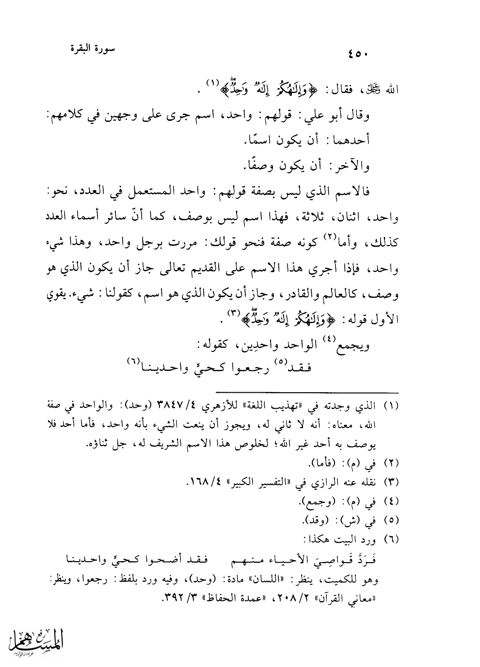 (¬1) الذي وجدته في "تهذيب اللغة" للأزهري 4/ 3847 (وحد): والواحد في صفة الله، معناه: أنه لا ثاني له، ويجوز أن ينعت الشيء بأنه واحد، فأما أحد فلا يوصف به أحد غير الله؛ لخلوص هذا الاسم الشريف له، جل ثناؤه.