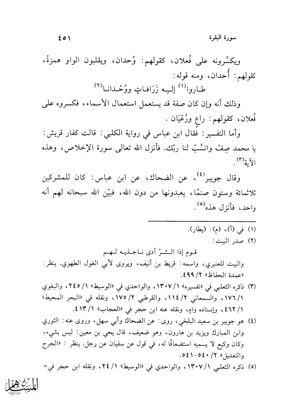 (¬3) ذكره الثعلبي في "تفسيره" 1/ 1307، والوا حدي في "الوسيط" 1/ 245، والبغوي 1/ 176، والسمعاني 2/ 114، والقرطبي 2/ 175، ونقله في "البحر المحيط" 1/ 462، وإسناده واه، ونقله عنه ابن حجر في "العجاب" 1/ 413.