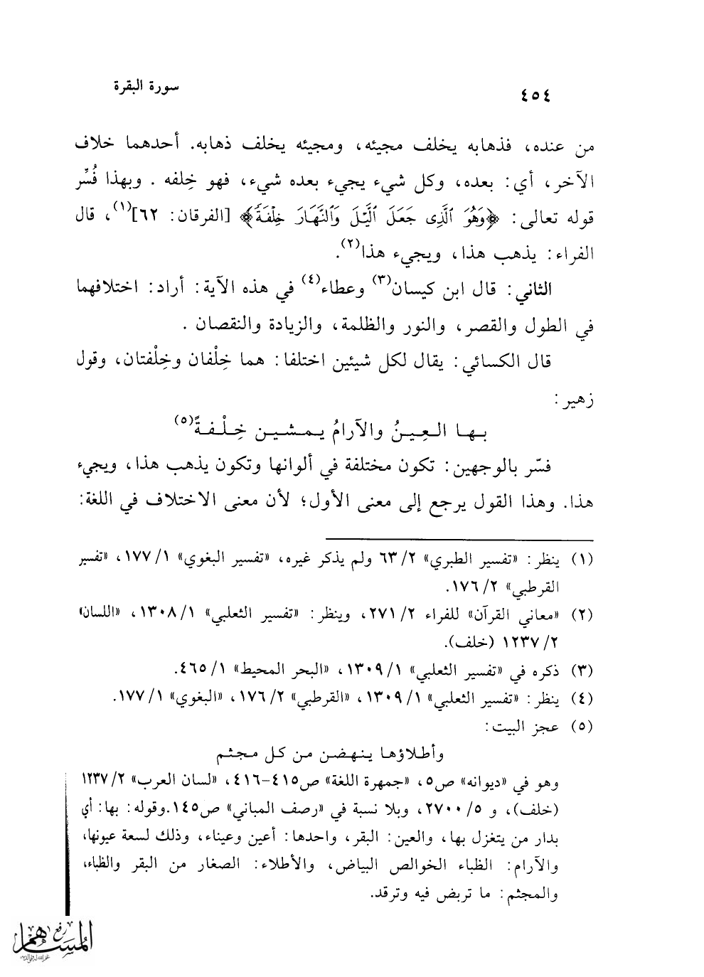من عنده، فذهابه يخلف مجيئه، ومجيئه يخلف ذهابه. أحدهما خلاف الآخر، أي: بعده، وكل شيء يجيء بعده شيء، فهو خِلفه. وبهذا فُسِّر قوله تعالى: {وَهُوَ الَّذِي جَعَلَ اللَّيْلَ وَالنَّهَارَ خِلْفَةً} [الفرقان: 62] (¬1)، قال الفراء: يذهب هذا، ويجيء هذا (¬2).