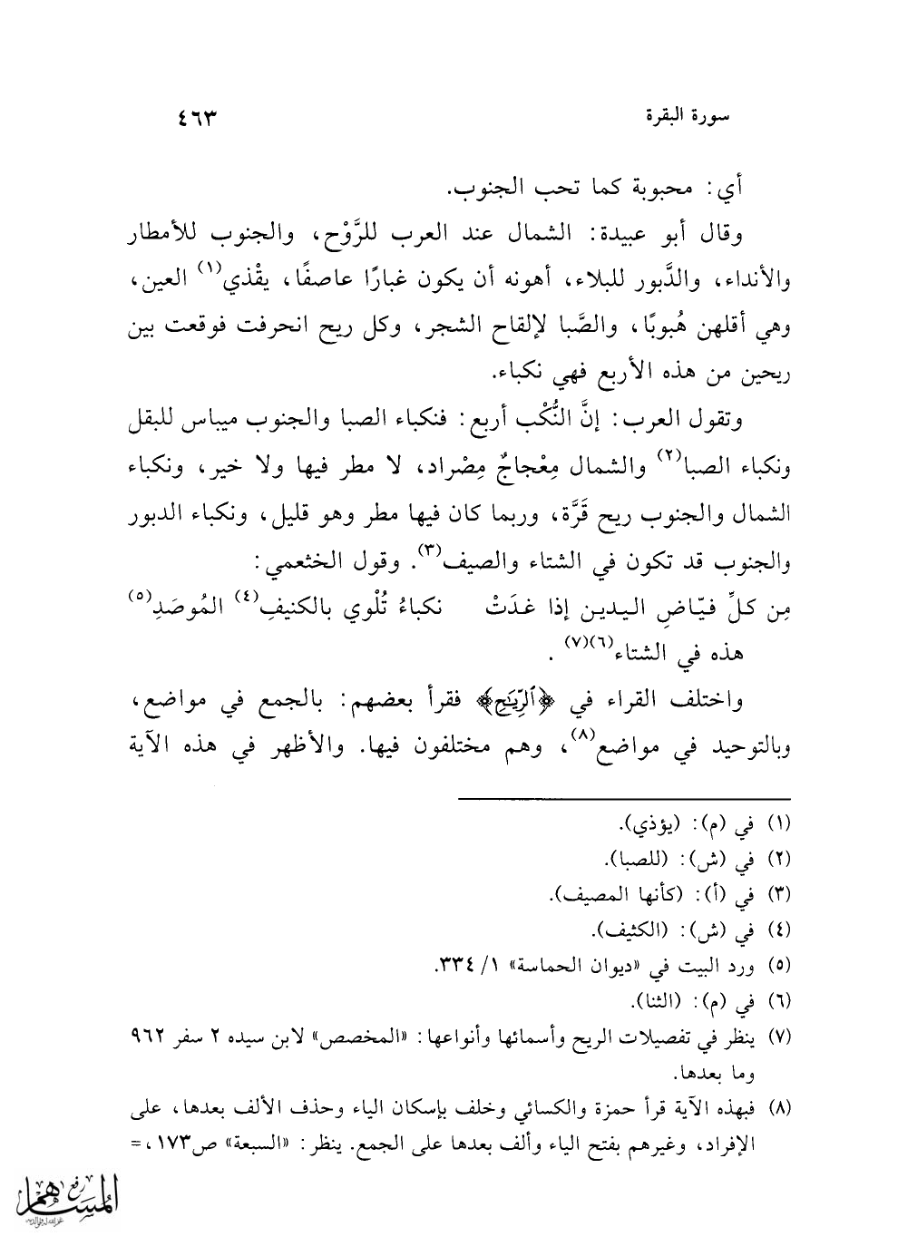 (¬7) ينظر في تفصيلات الريح وأسمائها وأنواعها:"المخصص" لابن سيده 2 سفر 962 وما بعدها.