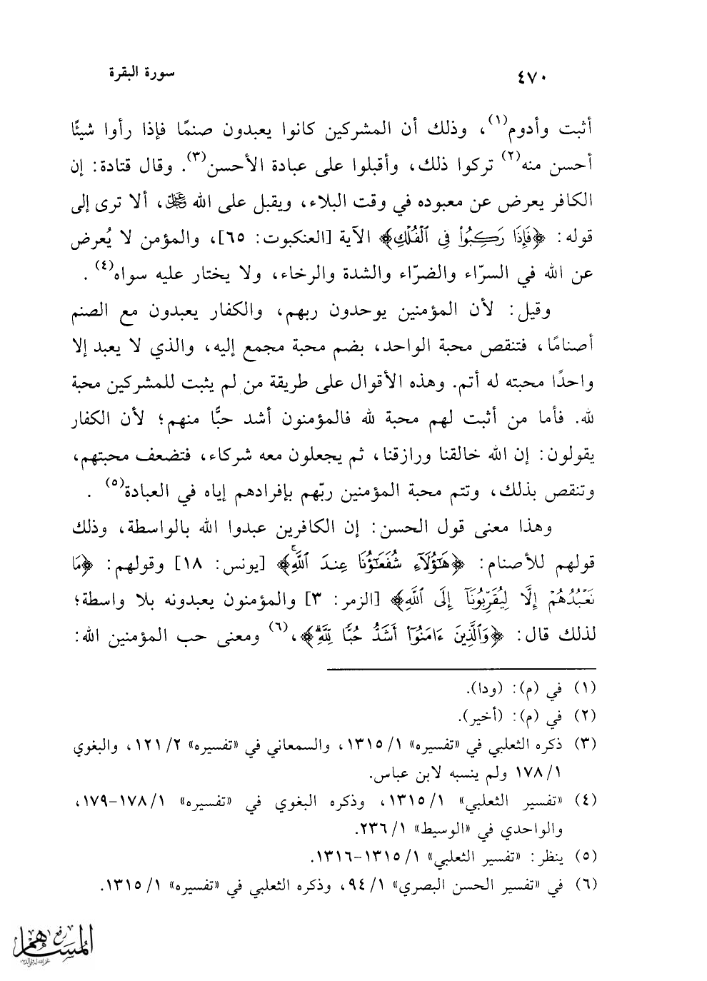 وهذا معنى قول الحسن: إن الكافرين عبدوا الله بالواسطة، وذلك قولهم للأصنام: {هَؤُلَاءِ شُفَعَاؤُنَا عِنْدَ اللَّهِ} [يونس: 18] وقولهم: {مَا نَعْبُدُهُمْ إِلَّا لِيُقَرِّبُونَا إِلَى اللَّهِ} [الزمر: 3] والمؤمنون يعبدونه بلا واسطة، لذلك قال: {وَالَّذِينَ آمَنُوا أَشَدُّ حُبًّا لِلَّهِ}، (¬6) ومعنى حب المؤمنين الله: