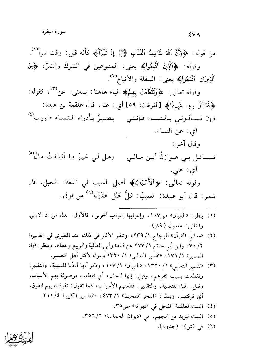 (¬3) "تفسير الثعلبي" 1/ 1320، "التبيان" 1/ 107، وذكر أنها أيضًا للسببية، والتقدير: وتقطعت بسبب كفرهم، وقيل: إنها للحال، أي تقطعت موصولة بهم الأسباب، وقيل: الباء للتعدية، والتقدير: قطعتهم الأسباب، كما تقول: تفرقت بهم الطرق، أي فرقتهم، وينظر: "البحر المحيط" 1/ 473، "التفسير الكبير" 4/ 211.