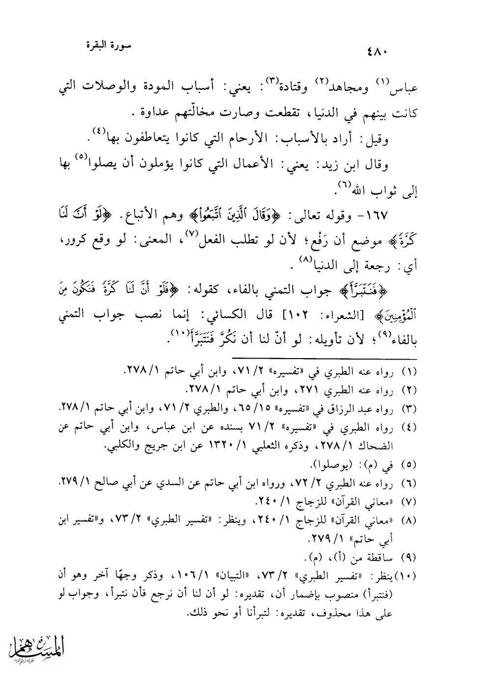 (¬10) ينظر: "تفسير الطبري" 2/ 73، "التبيان" 1/ 106، وذكر وجهًا آخر وهو أن (فنتبرأ) منصوب بإضمار أن، تقديره: لو أن لنا أن نرجع فأن نتبرأ، وجواب لو على هذا محذوف، تقديره. لتبرأنا أو نحو ذلك.