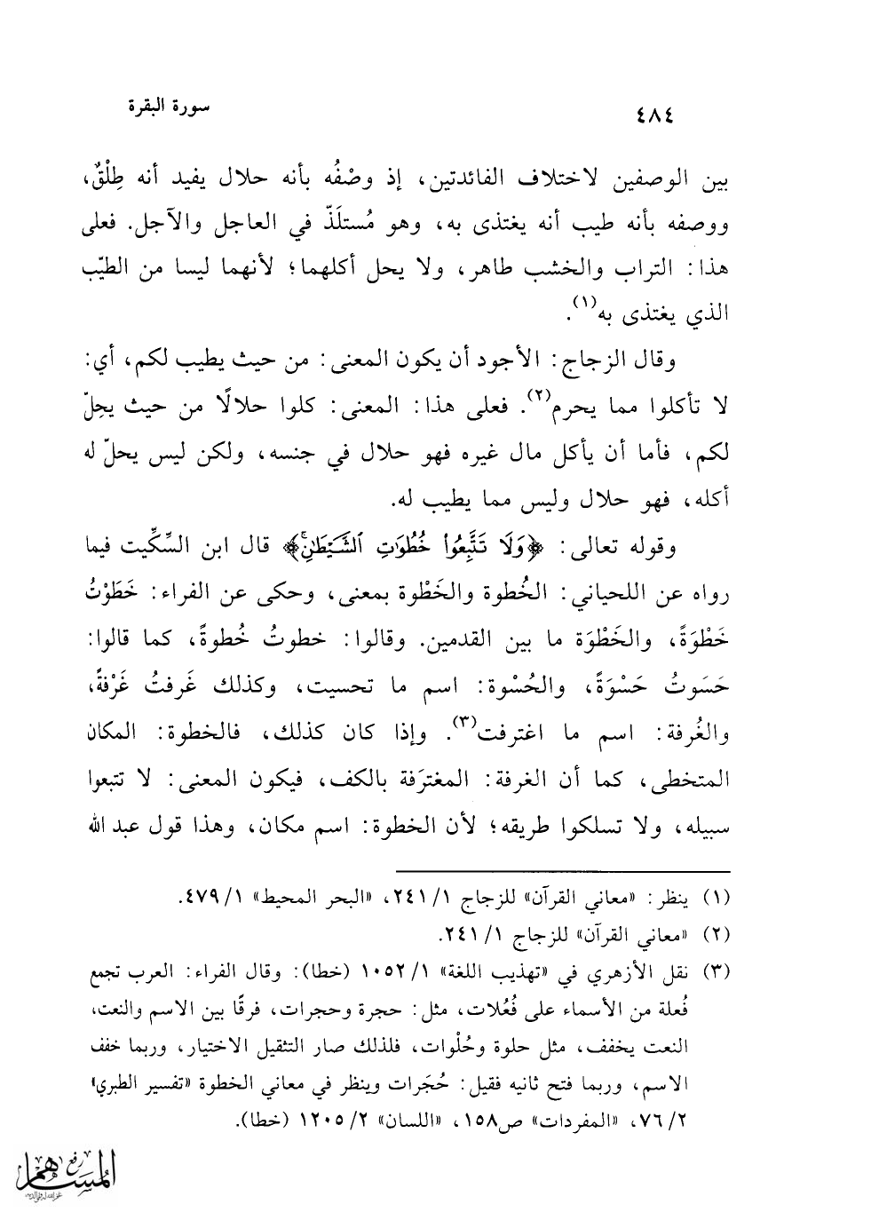 وقوله تعالى: {وَلَا تَتَّبِعُوا خُطُوَاتِ الشَّيْطَانِ} قال ابن السِّكِّيت فيما رواه عن اللحياني: الخُطوة والخَطْوة بمعنى، وحكى عن الفراء: خَطَوْتُ خَطْوَةً، والخَطْوَة ما بين القدمين. وقالوا: خطوتُ خُطوةً، كما قالوا: حَسَوتُ حَسْوَةً، والحُسْوة: اسم ما تحسيت، وكذلك غَرفتُ غَرْفةً، والغُرفة: اسم ما اغترفت (¬3). وإذا كان كذلك، فالخطوة: المكان المتخطى، كما أن الغرفة: المغترَفة بالكف، فيكون المعنى: لا تتبعوا سبيله، ولا تسلكوا طريقه، لأن الخطوة: اسم مكان، وهذا قول عبد الله