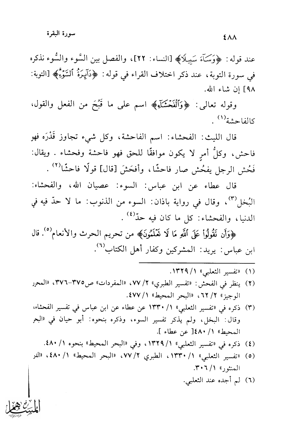 (¬2) ينظر في الفحش: "تفسير الطبري" 2/ 77، "المفردات" ص 375 - 376، "المحرر الوجيز" 2/ 62، "البحر المحيط" 1/ 477.