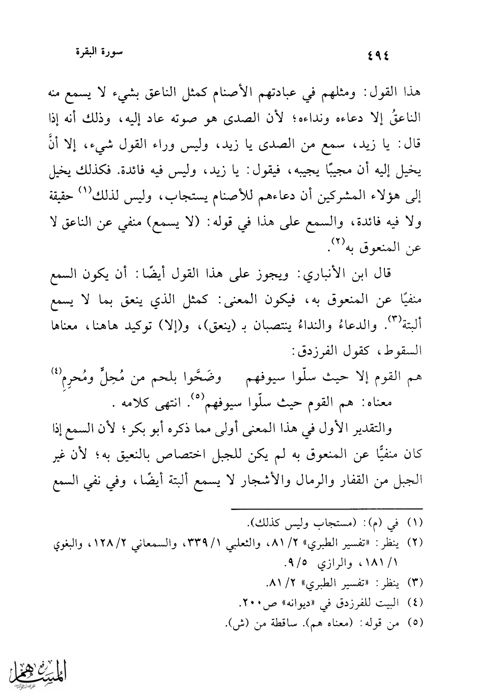 هذا القول: ومثلهم في عبادتهم الأصنام كمثل الناعق بشيء لا يسمع منه الناعقُ إلا دعاءه ونداءه؛ لأن الصدى هو صوته عاد إليه، وذلك أنه إذا قال: يا زيد، سمع من الصدى يا زيد، وليس وراء القول شيء، إلا أنَّ يخيل إليه أن مجيبًا يجيبه، فيقول: يا زيد، وليس فيه فائدة. فكذلك يخيل إلى هؤلاء المشركين أن دعاءهم للأصنام يستجاب، وليس لذلك (¬1) حقيقة ولا فيه فائدة، والسمع على هذا في قوله: (لا يسمع) منفي عن الناعق لا عن المنعوق به (¬2).
