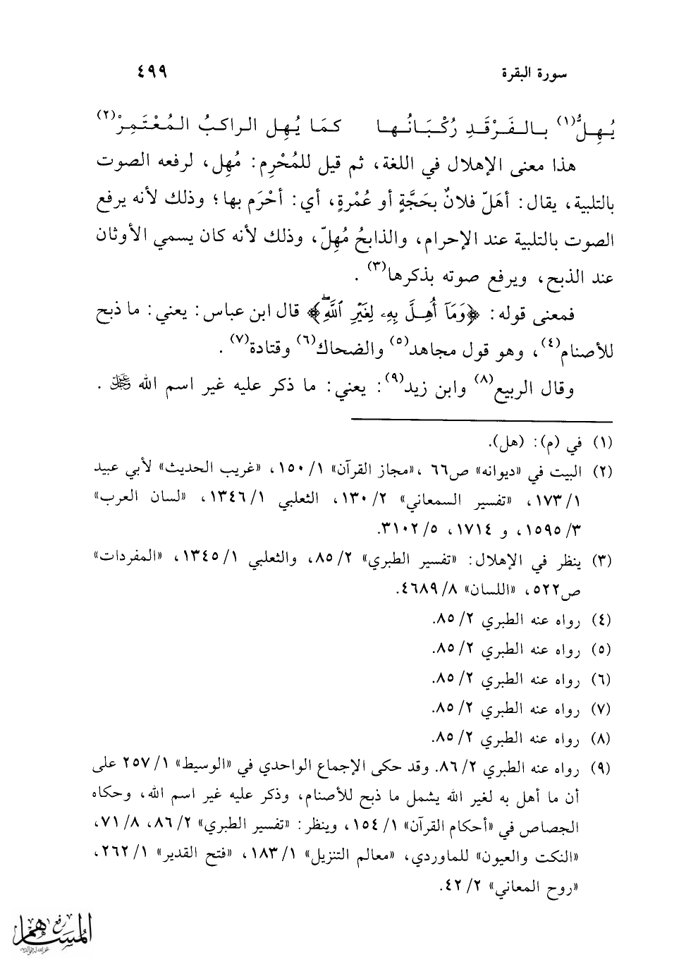 (¬9) رواه عنه الطبري 2/ 86. وقد حكى الإجماع الواحدي في "الوسيط" 1/ 257 على أن ما أهل به لغير الله يشمل ما ذبح للأصنام، وذكر عليه غير اسم الله، وحكاه الجصاص في "أحكام القرآن" 1/ 154، وينظر: "تفسير الطبري" 2/ 86، 8/ 71، "النكت والعيون" للماوردي، "معالم التنزيل" 1/ 183، "فتح القدير" 1/ 262، "روح المعاني" 2/ 42.