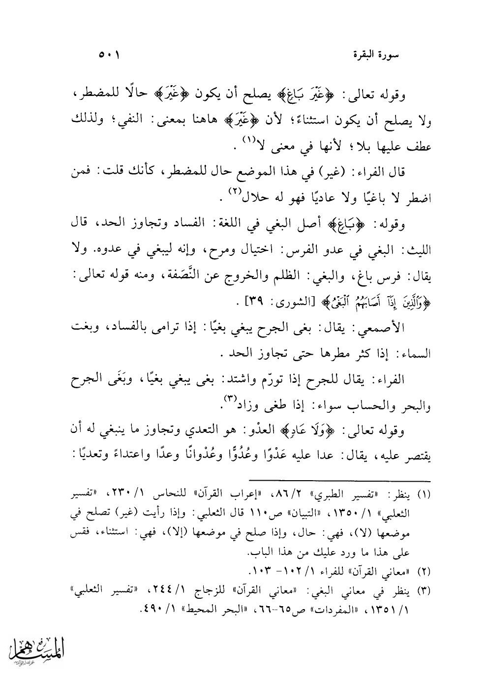 وقوله تعالى: {غَيْرَ بَاغٍ} يصلح أن يكون {غَيْرَ} حالًا للمضطر، ولا يصلح أن يكون استثناءً؛ لأن {غَيْرَ} هاهنا بمعنى: النفي؛ ولذلك عطف عليها بلا؛ لأنها في معنى لا (¬1).