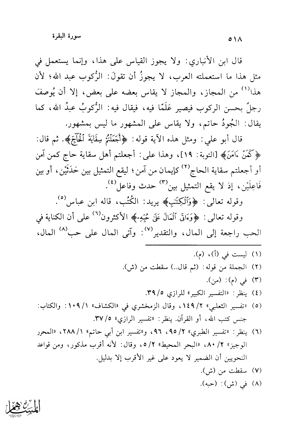وقوله تعالى: {وَآتَى الْمَالَ عَلَى حُبِّهِ} الأكثرون (¬6) على أن الكناية في الحب راجعة إلى المال، والتقدير (¬7): وآتى المال على حب (¬8) المال،