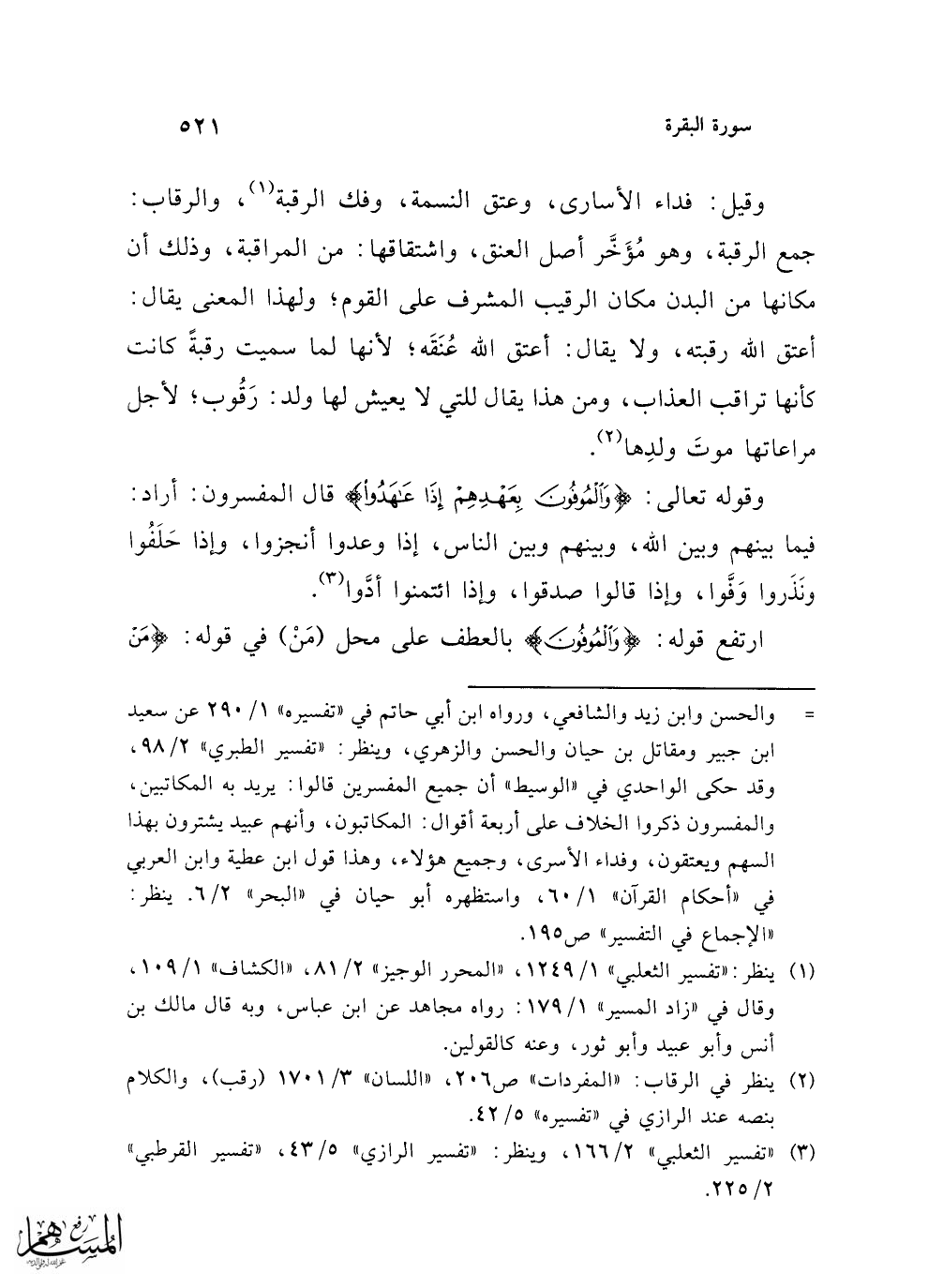 (¬2) ينظر في الرقاب: "المفردات" ص 206، "اللسان" 3/ 1701 (رقب)، والكلام بنصه عند الرازي في "تفسيره" 5/ 42.