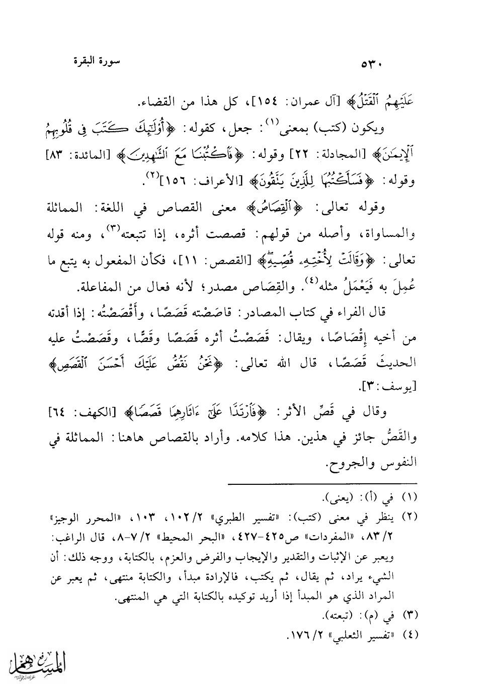 (¬2) ينظر في معنى (كتب): "تفسير الطبري" 2/ 102، 103، "المحرر الوجيز" 2/ 83، "المفردات" ص 425 - 427، "البحر المحيط" 2/ 7 - 8، قال الراغب: ويعبر عن الإثبات والتقدير والإيجاب والفرض والعزم، بالكتابة، ووجه ذلك: أن الشيء يراد، ثم يقال، ثم يكتب، فالإرادة مبدأ، والكتابة منتهى، ثم يعبر عن المراد الذي هو المبدأ إذا أريد توكيده بالكتابة التي هي المنتهى.