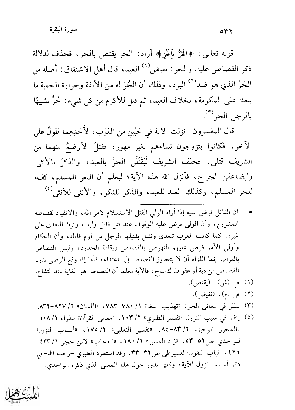 قوله تعالى: {اَلحُرُّ باَلحُرِّ} أراد: الحر يقتص بالحر، فحذف لدلالة ذكر القصاص عليه. والحر: نقيض (¬1) العبد، قال أهل الاشتقاق: أصله من الحَرِّ الذي هو ضد (¬2) البرد، وذلك أن الحُرّ له من الأنفة وحرارة الحمية ما يبعثه على المكرمة، بخلاف العبد، ثم قيل للأكرم من كل شيء: حُرٌّ تشبيهًا بالرجل الحر (¬3).