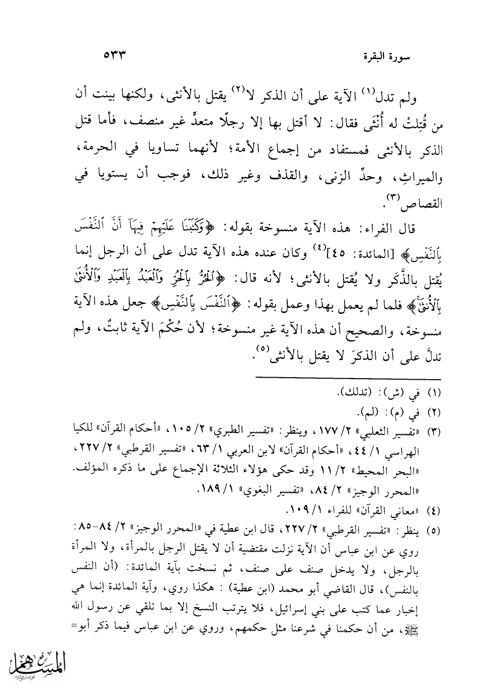قال الفراء: هذه الآية منسوخة بقوله: {وَكَتَبْنَا عَلَيْهِمْ فِيهَا أَنَّ النَّفْسَ بِالنَّفْسِ} [المائدة: 45] (¬4) وكان عنده هذه الآية تدل على أن الرجل إنما يُقتل بالذَّكَر ولا يُقتل بالأنثى؛ لأنه قال: {الْحُرُّ بِالْحُرِّ وَالْعَبْدُ بِالْعَبْدِ وَالْأُنْثَى بِالْأُنْثَى} فلما لم يعمل بهذا وعمل بقوله: {اَلنَّفسَ بِالنَّفسِ} جعل هذه الآية منسوخة، والصحيح أن هذه الآية غير منسوخة؛ لأن حُكْمَ الآية ثابتٌ، ولم تدلَّ على أن الذكرَ لا يقتل بالأنثى (¬5).