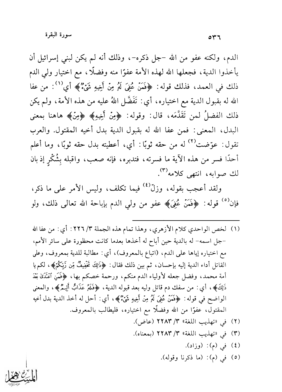 (¬1) لخص الواحدي كلام الأزهري، وهذا تمام هذه الجملة 3/ 226: أي: من عفا الله -جل اسمه- له بالدية حين أباح له أخذها بعدما كانت محظورة على سائر الأمم، مع اختياره إياها على الدم، (اتباع بالمعروف)، أي: مطالبة للدية بمعروف، وعلى القاتل أداء الدية إليه بإحسان، ثم بين ذلك فقال: {ذَلِكَ تَخْفِيفٌ مِنْ رَبِّكُمْ}، لكم يا أمة محمد، وفضل جعله لأولياء الدم منكم، ورحمة خصكم بها، {فَمَنِ اعْتَدَى بَعْدَ ذَلِكَ}، أي: من سفك دم قاتل وليه بعد قبوله الدية، {فَلَهُ عَذَابٌ أَلِيمٌ}، والمعنى الواضح في قوله: {فَمَنْ عُفِيَ لَهُ مِن أَخِيهِ شَئٌ}، أي: أحل له أخذ الدية بدل أخيه المقتول، عفوًا من الله وفضلًا مع اختياره، فليطالب بالمعروف.