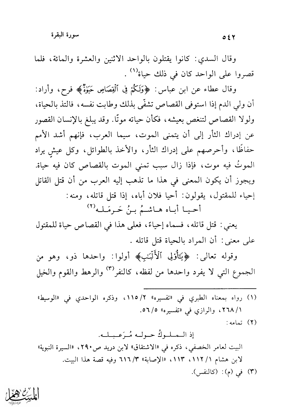 وقال السدي: كانوا يقتلون بالواحد الاثنين والعشرة والمائة، فلما قصروا على الواحد كان في ذلك حياة (¬1).